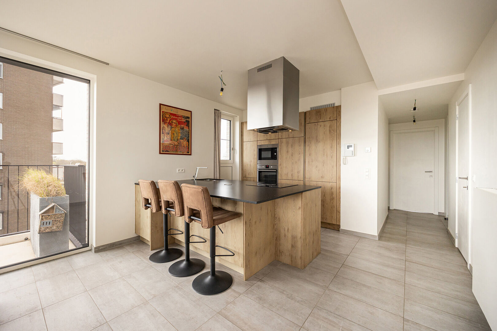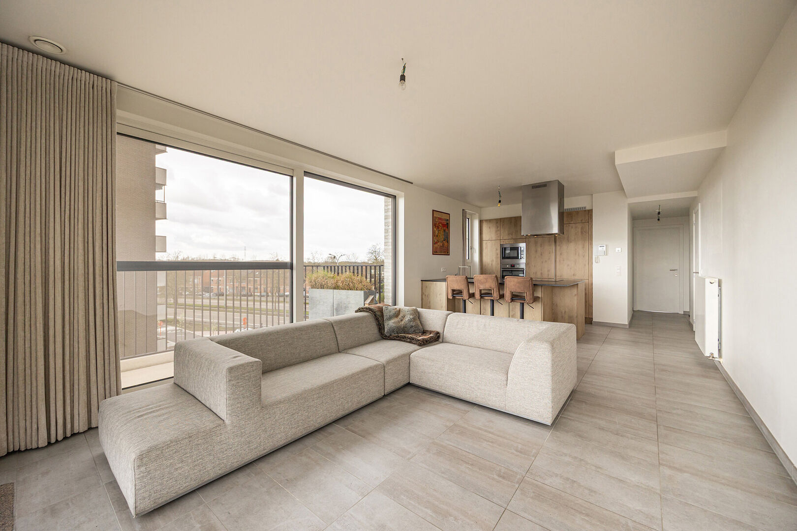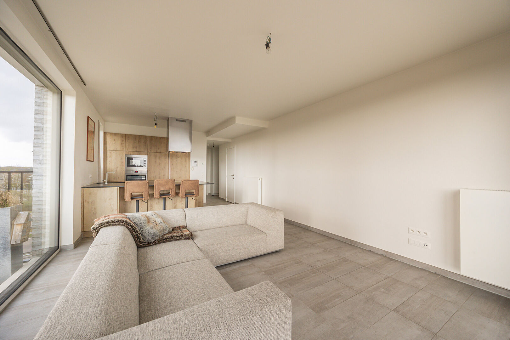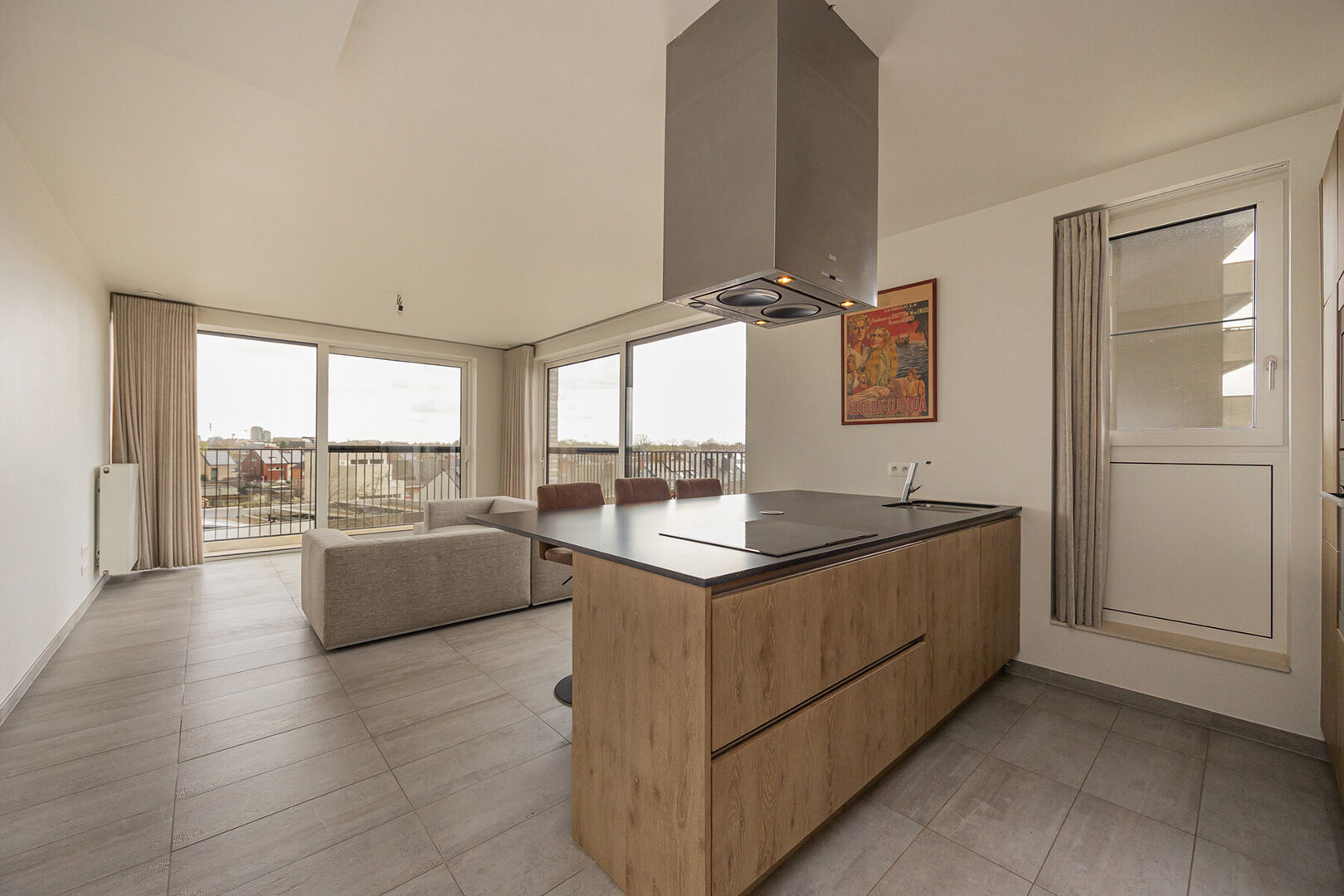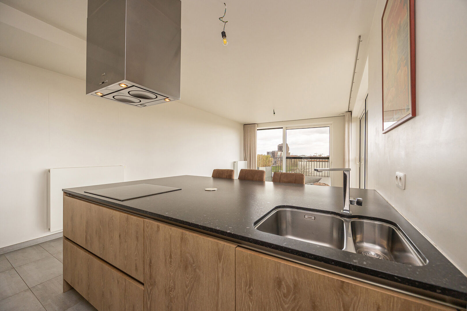 De leefruimte met open keuken vormt het kloppend hart van de woning en nodigt uit tot gezellige avonden, of je nu uitgebreid kookt of gewoon geniet van een goed glas wijn. De keuken is royaal uitgerust met alle moderne toestellen, zodat ook het praktische aspect moeiteloos mee kan volgen.