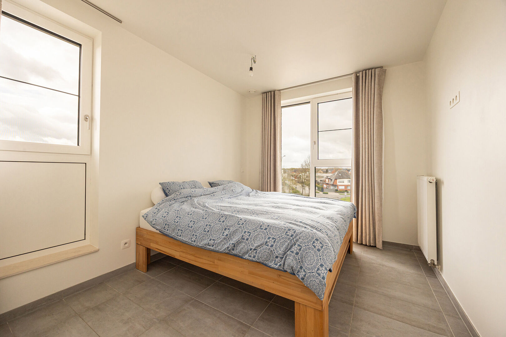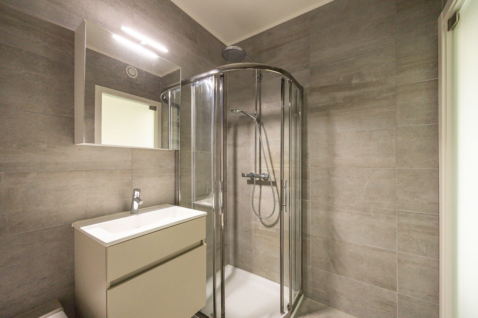 Het appartement beschikt over twee volwaardige slaapkamers, waardoor er voldoende ruimte is voor een gezin, een thuiskantoor of gewoon dat beetje extra comfort. De badkamer werd neutraal en stijlvol afgewerkt en biedt zowel een ligbad als een inloopdouche, zodat je nooit meer moet kiezen tussen snel en ontspannen. Bovendien is er een apart gastentoilet.