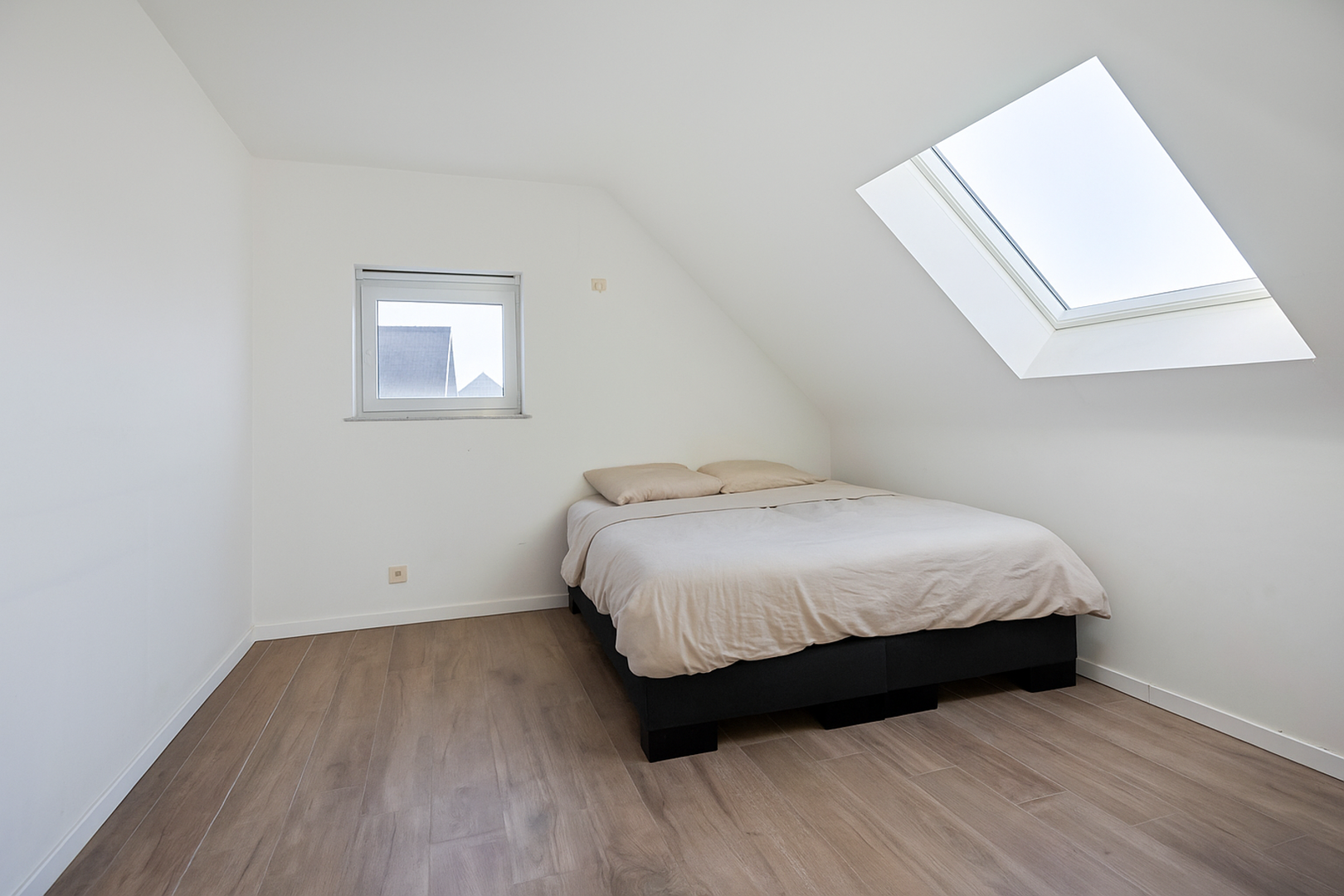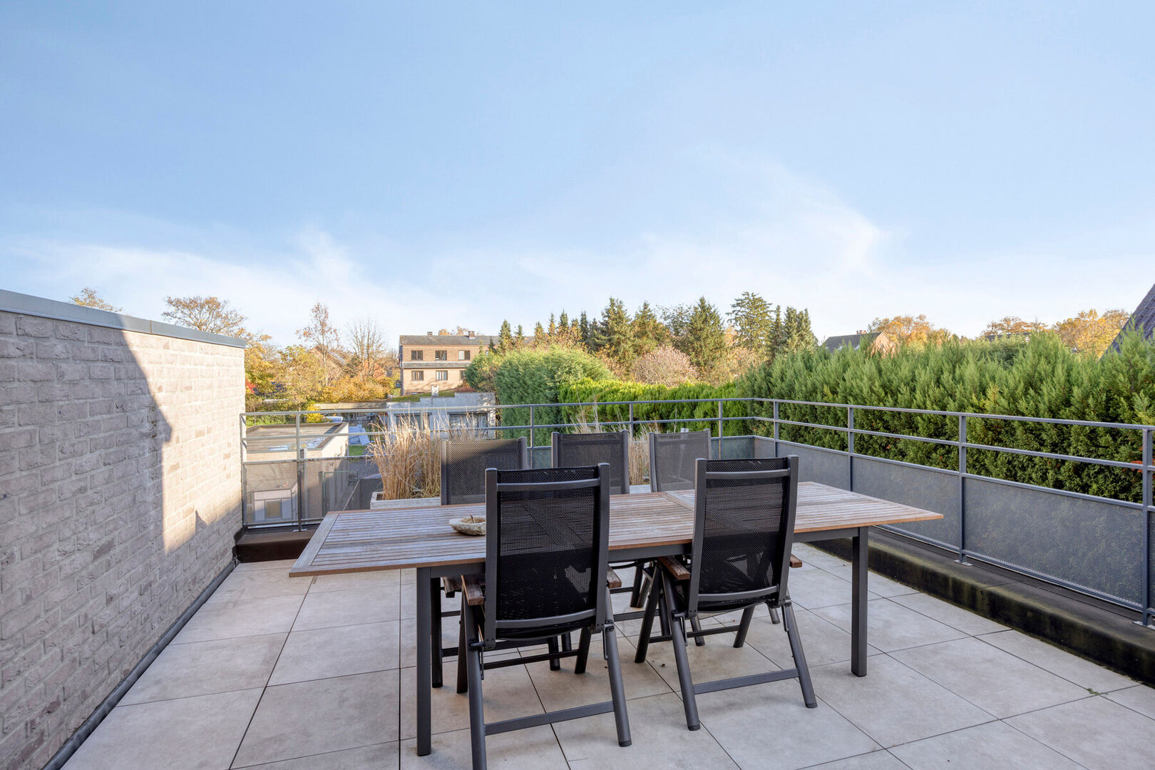 De woonkamer wordt gekenmerkt door een groot raampartij dat toegang geeft tot het private, zonovergoten terras van 20m2. Vanuit de woonkamer kan je via de mooi weggewerkte trap de bovenverdieping van dit appartement bereiken. Hier vinden we dan de twee slaapkamers en de badkamer terug. De badkamer werd afgewerkt met een op maat gemaakt lavabomeubel, leuke inloopdouche en nog een tweede toilet.