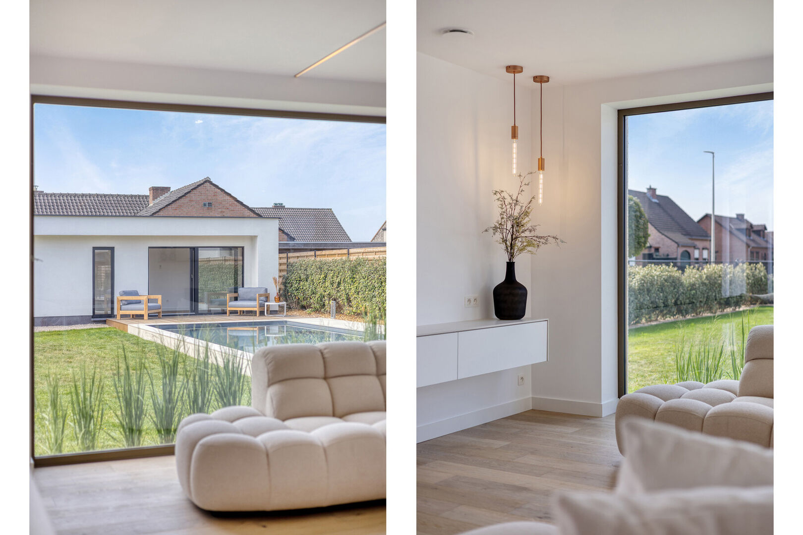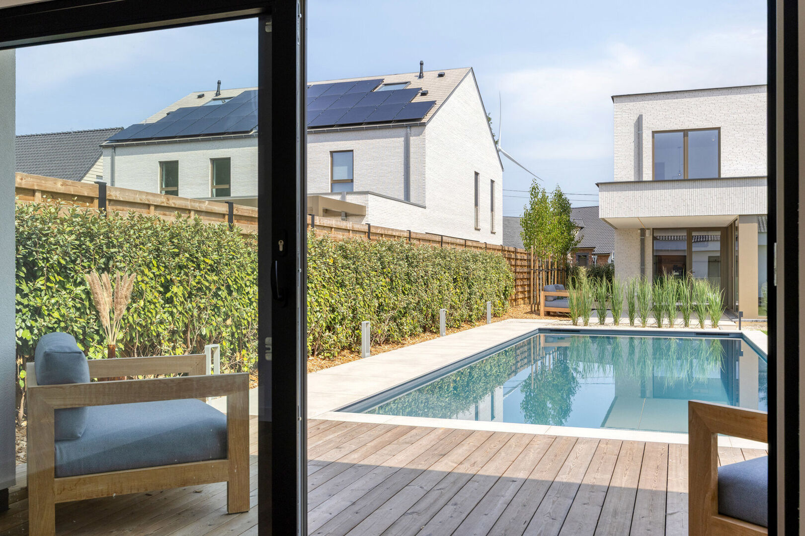 Binnen wordt u verwelkomd door een lichte, open, inkomhal die ons toegang geeft tot het gastentoilet, de trap naar de eerste verdieping, de wasruimte en de inpandige garage. De leefruimte ligt achteraan de woning en ademt luxe, kwaliteit en duurzaamheid. De leefruimte, met geïntegreerde open keuken, heeft zicht op tuin en op het zwembad. Hier ook weer enorm veel lichtinval door de zuid-west orientatie van de tuin. Middagzon op het zwembad en avondzon op het terras, heerlijk toch?