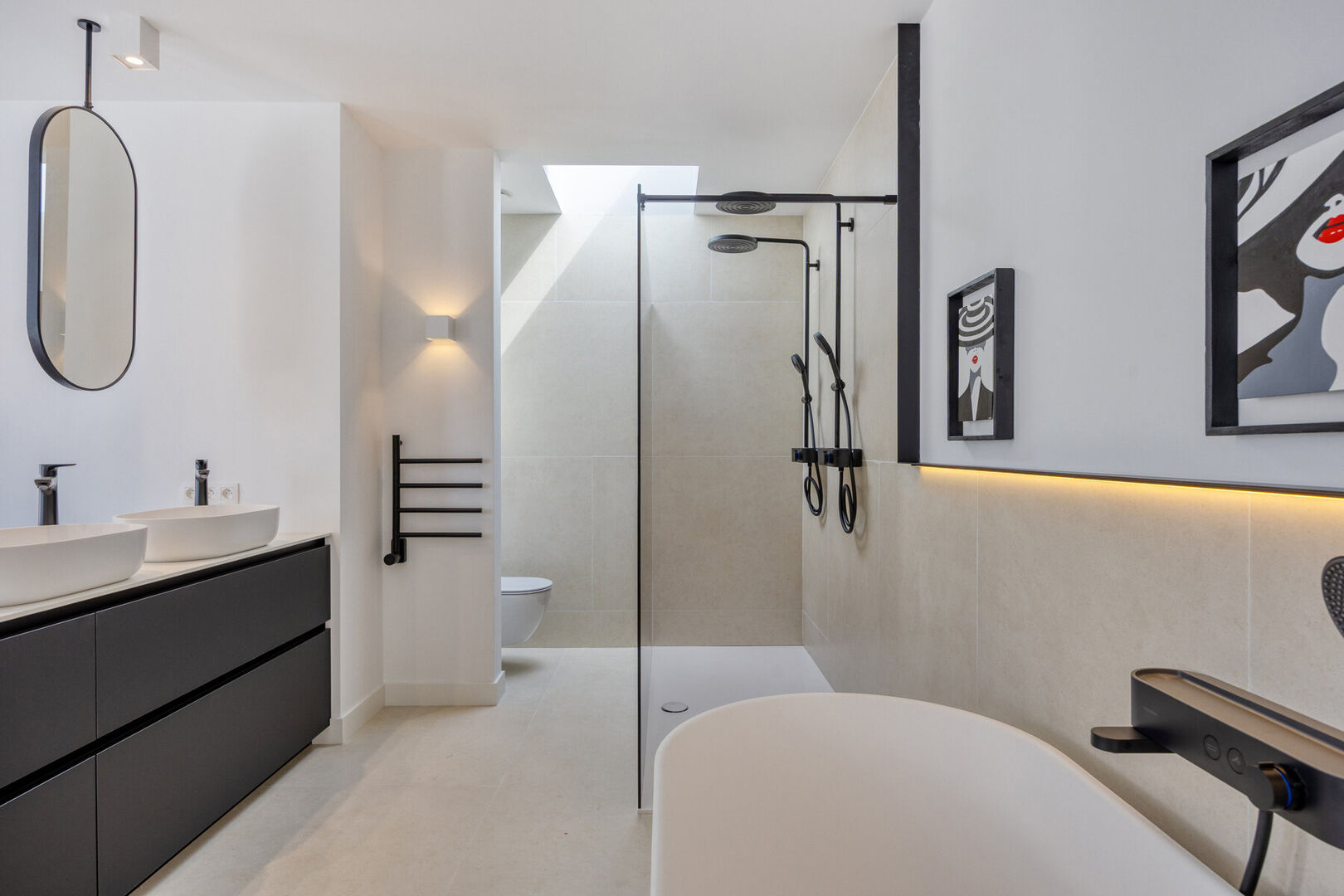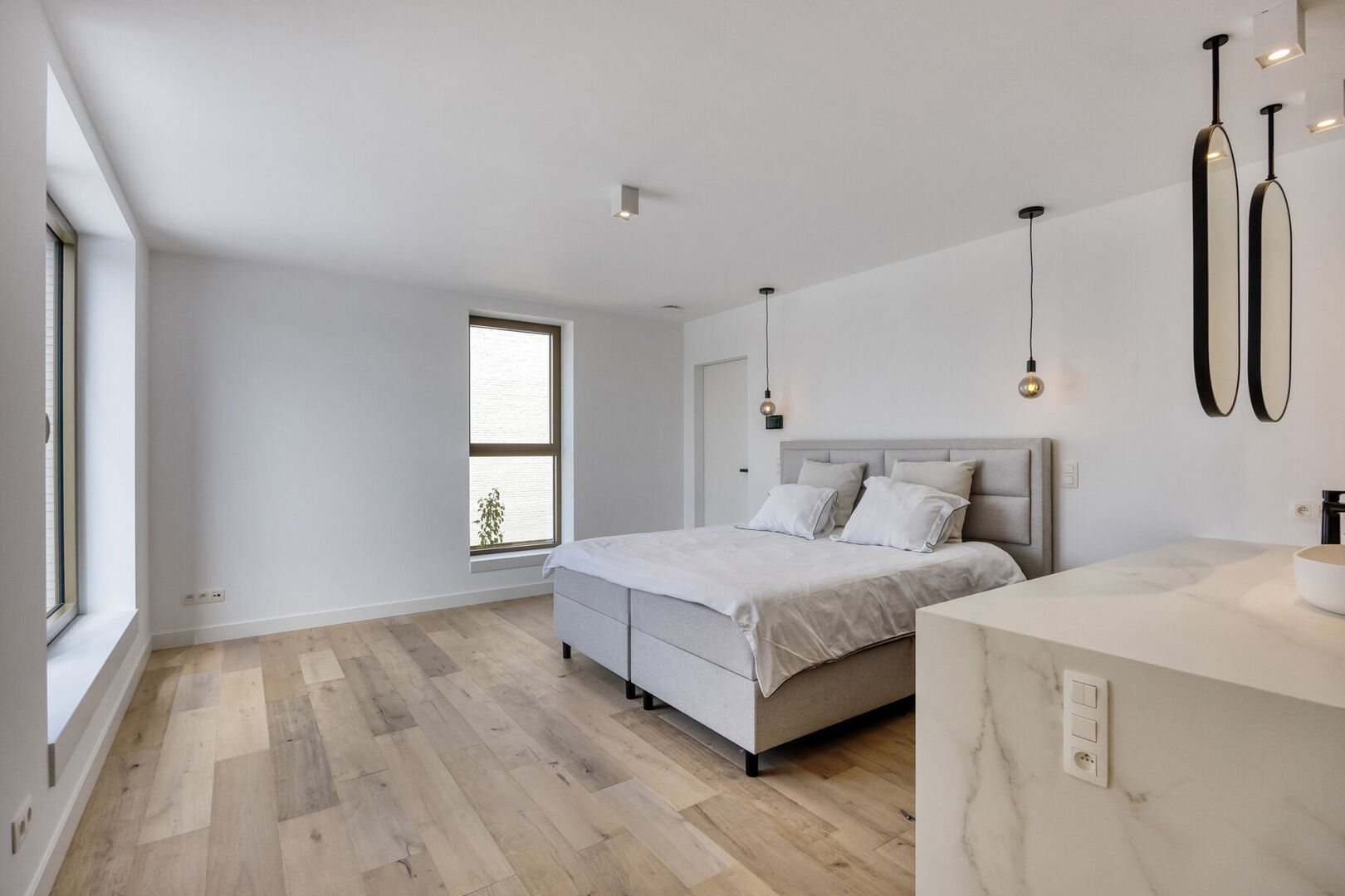 Op de eerste verdieping vinden we de nachthal, 2 badkamers en drie slaapkamers terug. De nachthal werd voorzien van een aparte open ruimte die kan dienen als 'workspace'. Hier werden reeds een bureaumeubel (inbouw) voorzien. De twee kinderkamers zijn meer dan ruim en bieden beiden plaats voor een dubbel bed. Voor de kinderen werd er bovendien een aparte badkamer met inloopdouche en toilet voorzien. De hoofdslaapkamer heeft meer weg van een luxe suite in een hotel dan van een gewone slaapkamer. De badkamer met dubbele inloopdouche, bad, toilet en make-up ruimte werd volledig geintegreerd in de slaapkamer. Ook hier werd aircoo voorzien, luxe ten top!