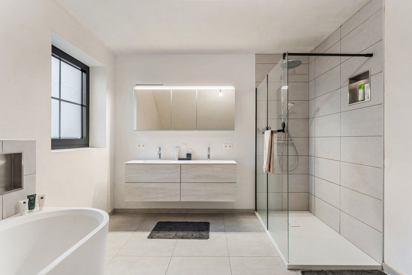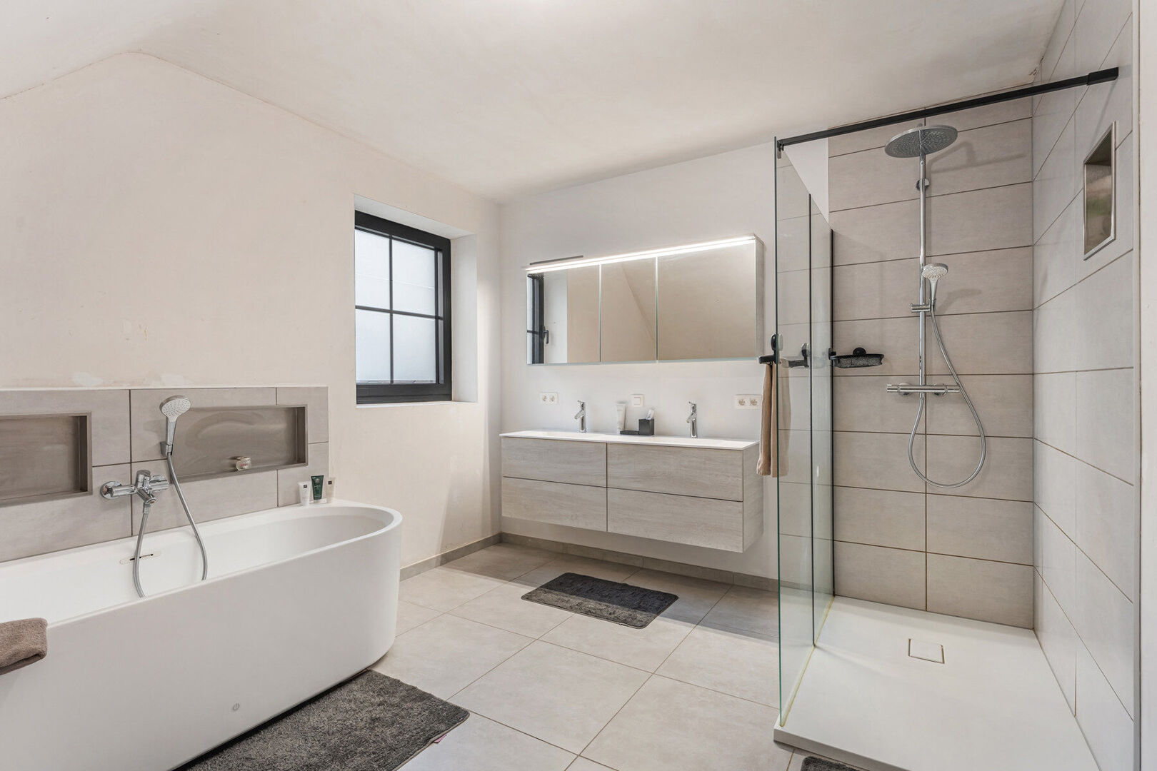 Via de met natuursteen beklede trap in de leefruimte betreed je de eerste verdieping. De ruime nachthal leidt naar een apart toilet, naar de uiterst ruime badkamer met maatkasten, ligbad, inloopdouche en dubbel badkamermeubel met lavabo’s en verder naar de 3 slaapkamers waarvan de master-bedroom over een ingerichte, dressing ensuite beschikt. Tot slot leidt een tweede vaste trap naar de ingerichte zolderverdieping (met hier warmtepomp, ventilatiesysteem D en omvormer zonnepanelen aanwezig) die naar eigen behoefte nog invulling kan krijgen (denk aan een vierde, uiterst ruime slaapkamer, bureel, speelkamer, ruimte voor vrijetijdsbesteding,…).