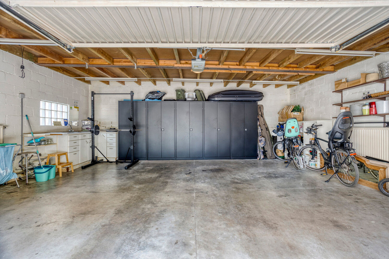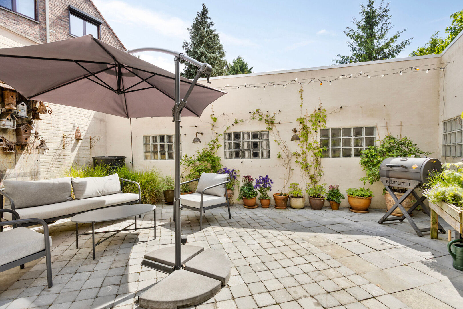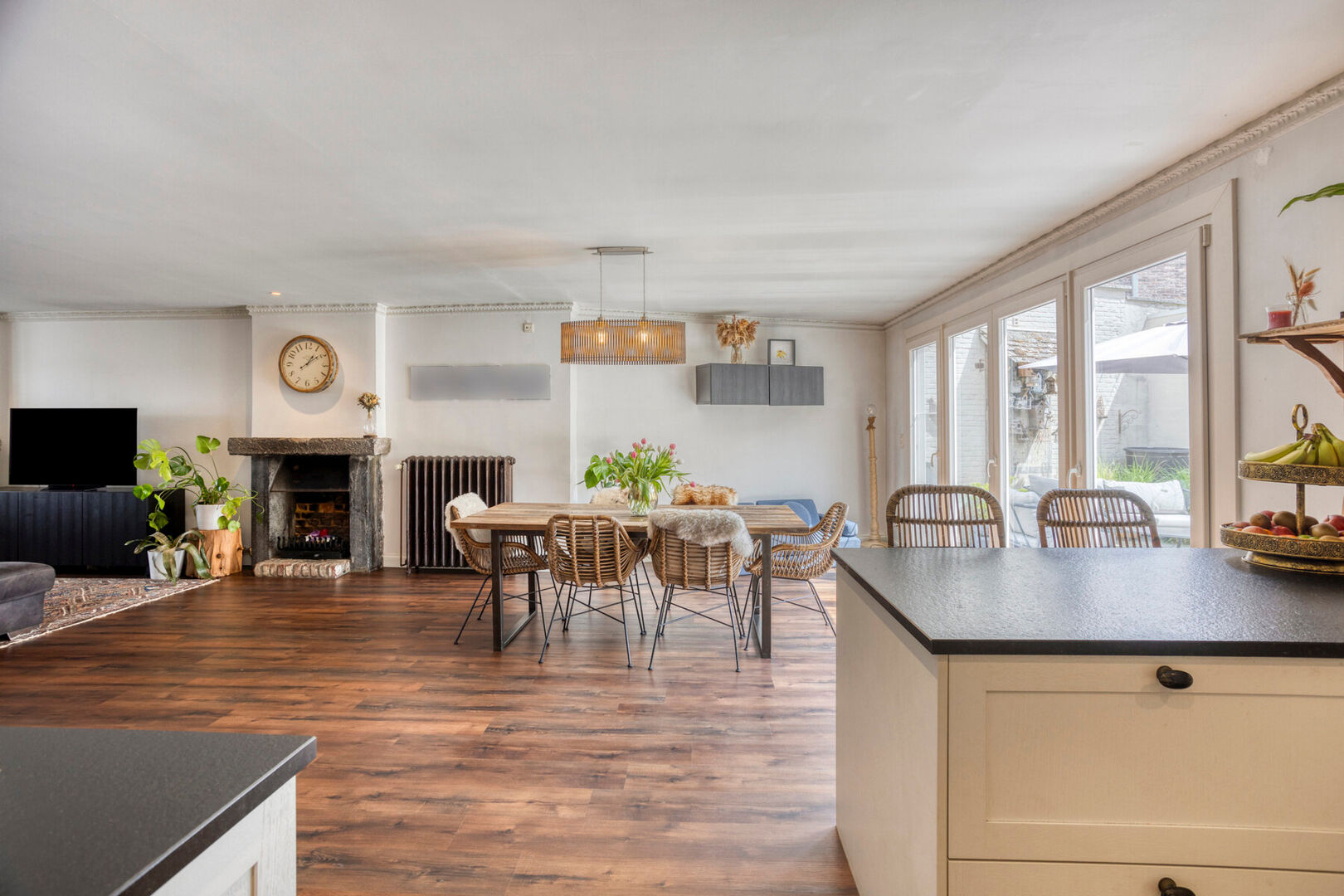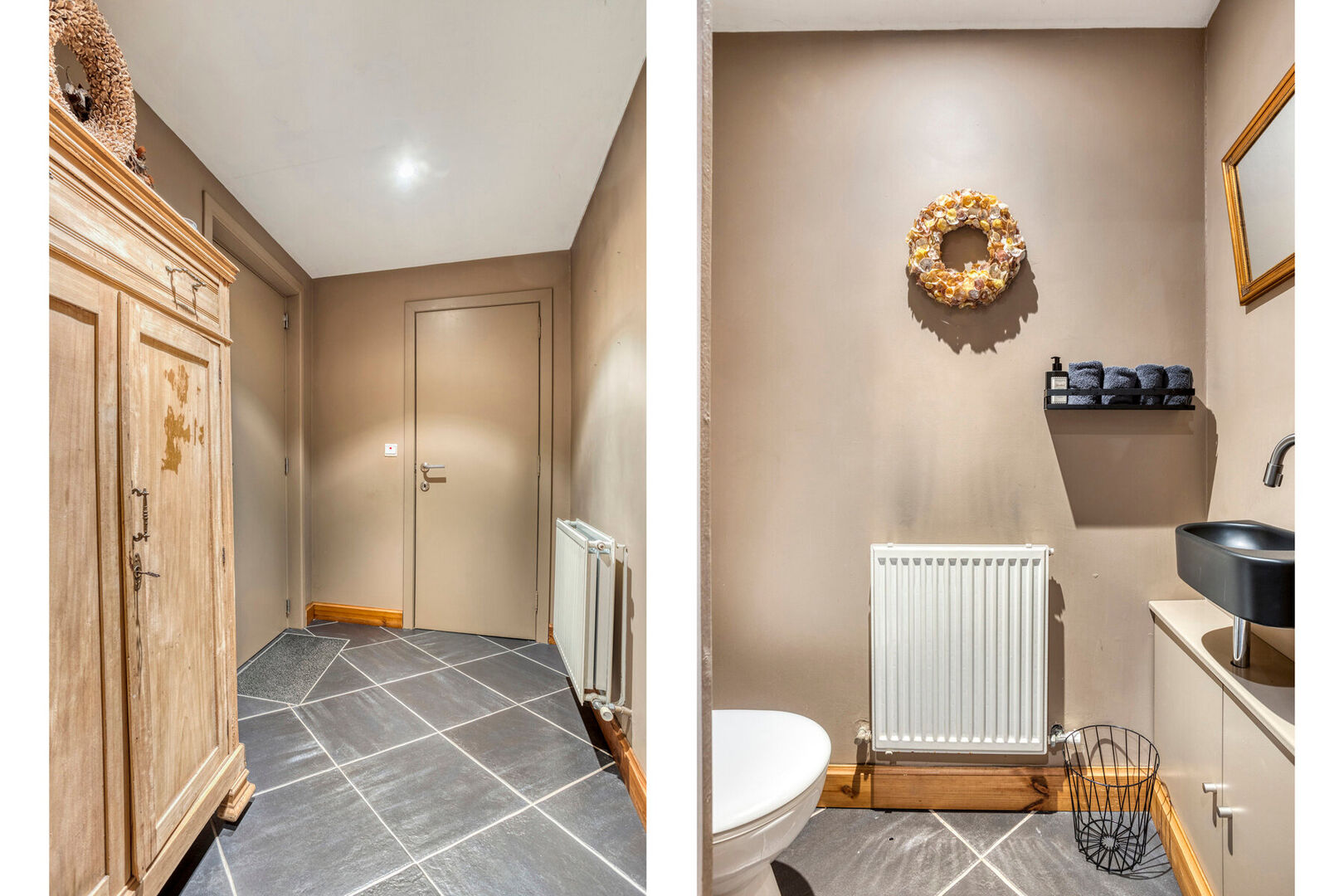Via de voordeur betreed je eerst de gemeenschappelijke hal die meteen links naar de private toegang van de woning leidt. Het is aangenaam binnenkomen in deze ruime inkomhal die rechts meer dan voldoende vestiaireruimte biedt en links naar het gastentoilet leidt. Rechtdoor kom je terecht in de uiterst ruime woonkamer (68m2) met knappe, gietijzeren radiatoren en maar liefst twee open (gas)haarden. De open keuken en toegang naar het ommuurt stadstuintje vind je hier ook terug. Deze stadstuin / dit stadsterras verrast met zijn ongelofelijke charme en is de hele dag zonovergoten. Bovendien hoor je hier niets van de weg vooraan. De landelijk-moderne keuken met eiland werd uitgerust met granieten werkbladen en de nodige kwalitatieve toestellen waaronder een groot design-gasfornuis van SMEG met ruime oven en warmtelade. Na de keuken tref je eerst de ruime wasplaats met technische uitrustingen en daarna de hal met achterdeur en apart toilet. Vanuit deze ruimte heb je ook toegang tot de zeer ruime garage met automatische kantelpoort, waar twee (normale) gezinswagens in passen en je nog meer dan voldoende bergruimte hebt. De garage is te bereiken via de Godsheidestraat (zijstraatje), langs de elektrische toegangspoort in ditto stijl als de woning. De oprit voor de garage en voordeur zorgen samen voor meer dan voldoende parkeergelegenheid.