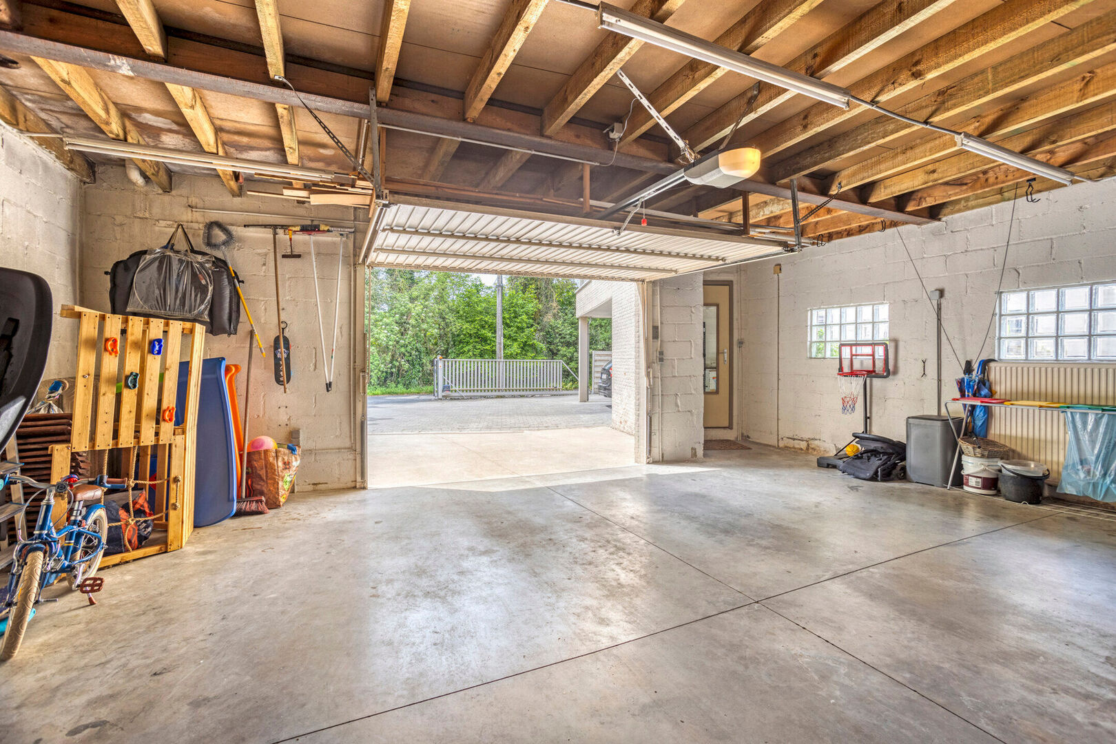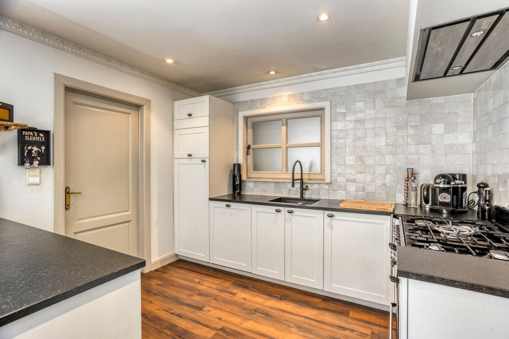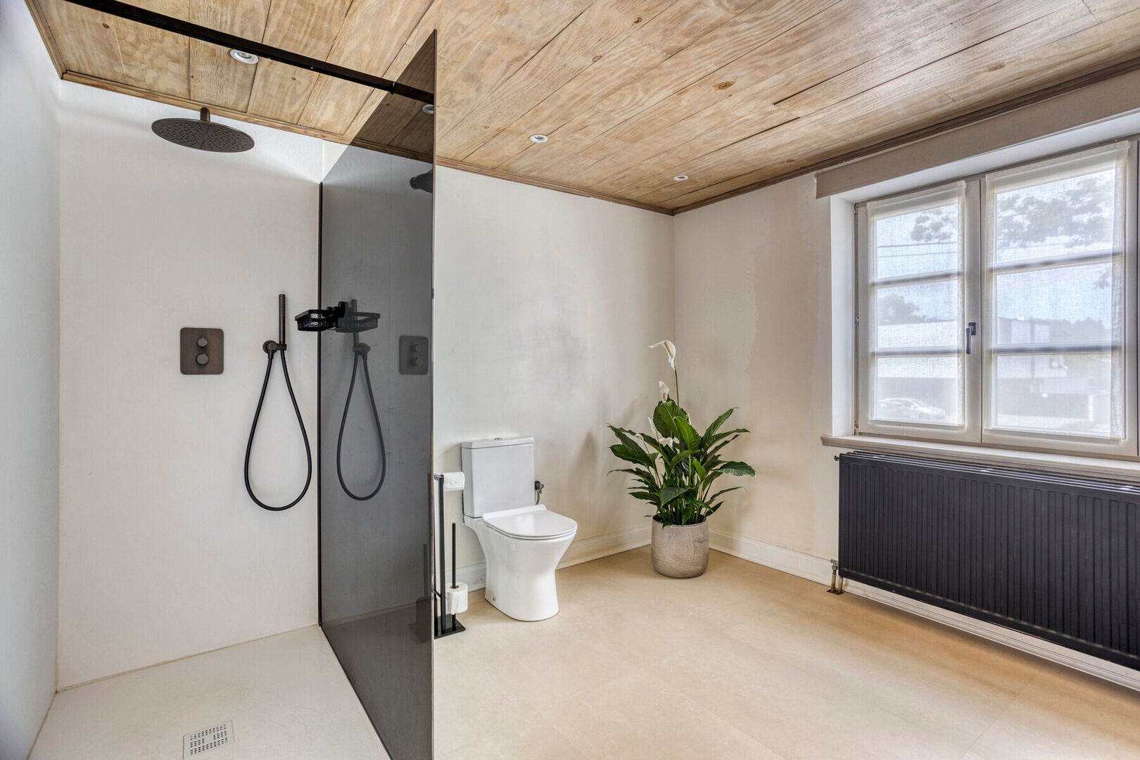 Via de voordeur betreed je eerst de gemeenschappelijke hal die meteen links naar de private toegang van de woning leidt. Het is aangenaam binnenkomen in deze ruime inkomhal die rechts meer dan voldoende vestiaireruimte biedt en links naar het gastentoilet leidt. Rechtdoor kom je terecht in de uiterst ruime woonkamer (68m2) met knappe, gietijzeren radiatoren en maar liefst twee open (gas)haarden. De open keuken en toegang naar het ommuurt stadstuintje vind je hier ook terug. Deze stadstuin / dit stadsterras verrast met zijn ongelofelijke charme en is de hele dag zonovergoten. Bovendien hoor je hier niets van de weg vooraan. De landelijk-moderne keuken met eiland werd uitgerust met granieten werkbladen en de nodige kwalitatieve toestellen waaronder een groot design-gasfornuis van SMEG met ruime oven en warmtelade. Na de keuken tref je eerst de ruime wasplaats met technische uitrustingen en daarna de hal met achterdeur en apart toilet. Vanuit deze ruimte heb je ook toegang tot de zeer ruime garage met automatische kantelpoort, waar twee (normale) gezinswagens in passen en je nog meer dan voldoende bergruimte hebt. De garage is te bereiken via de Godsheidestraat (zijstraatje), langs de elektrische toegangspoort in ditto stijl als de woning. De oprit voor de garage en voordeur zorgen samen voor meer dan voldoende parkeergelegenheid.