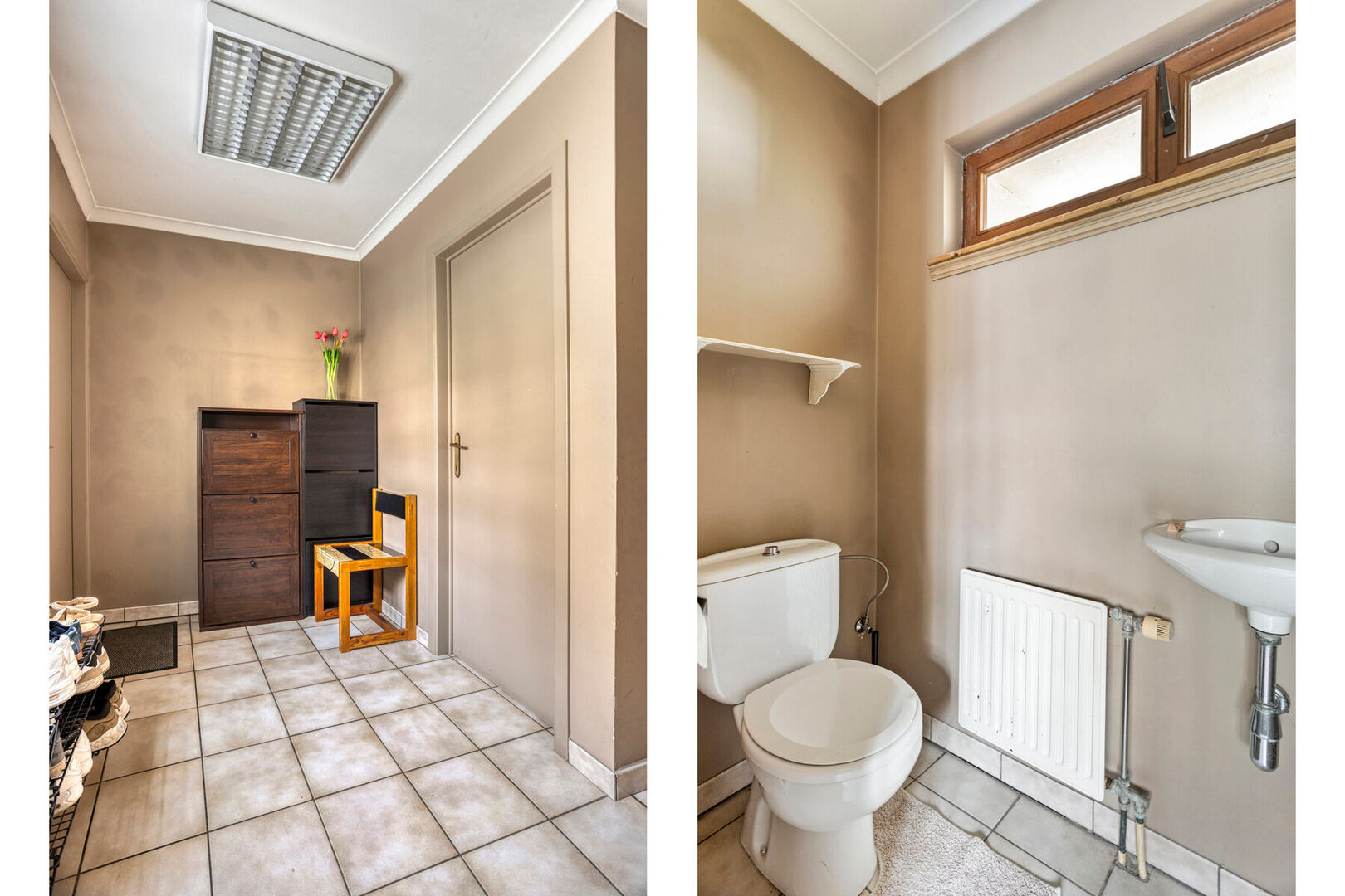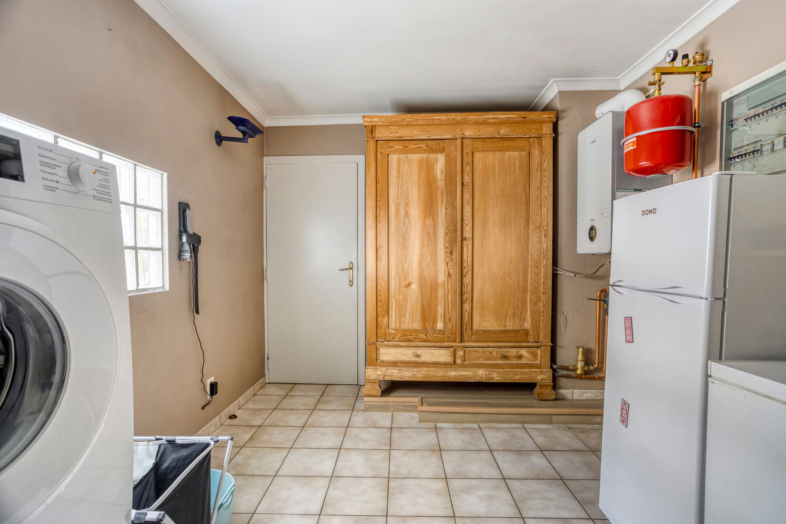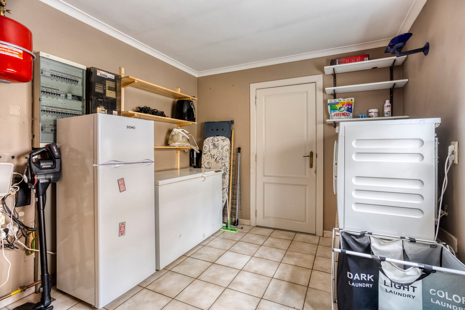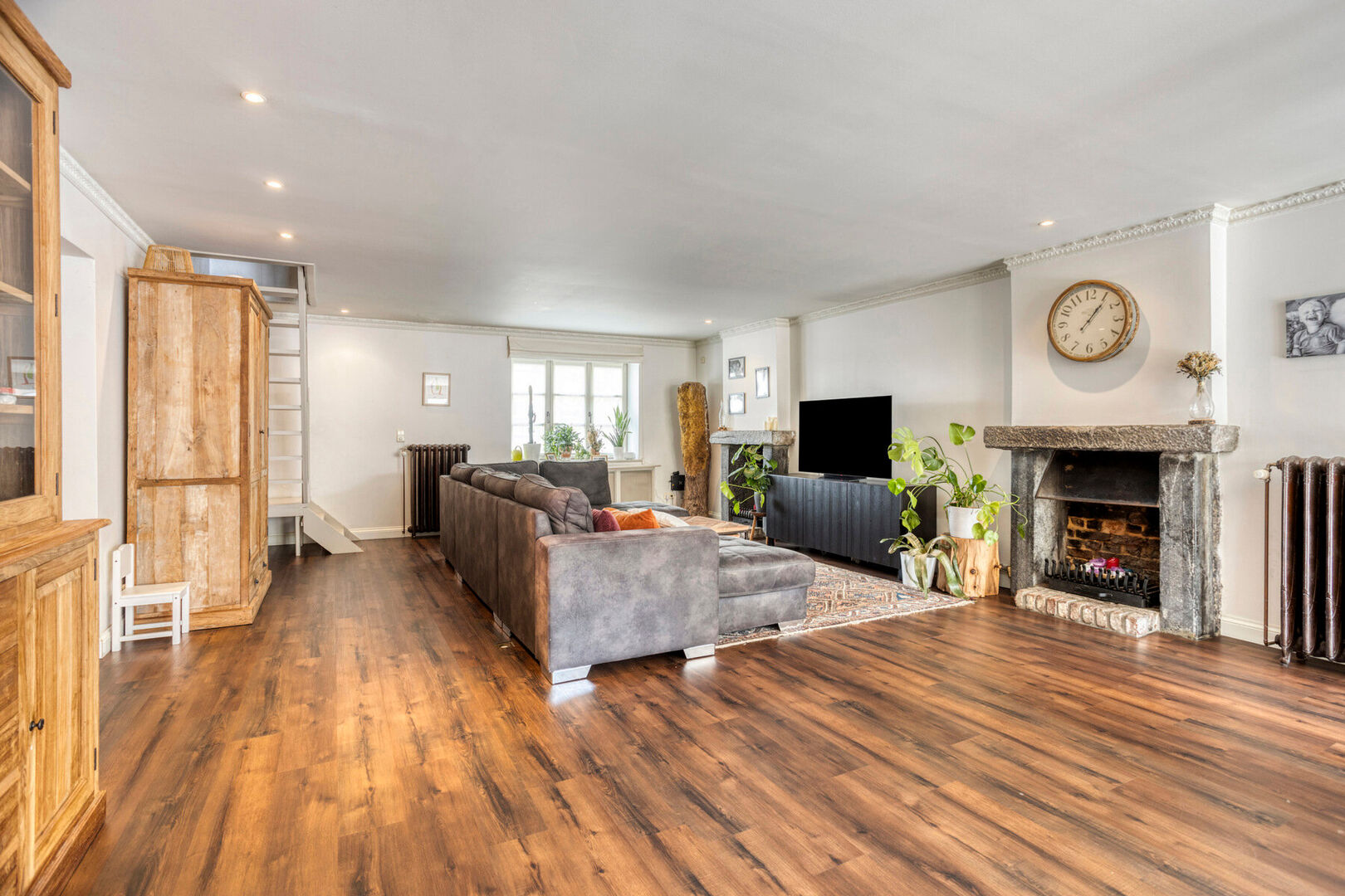 Via de voordeur betreed je eerst de gemeenschappelijke hal die meteen links naar de private toegang van de woning leidt. Het is aangenaam binnenkomen in deze ruime inkomhal die rechts meer dan voldoende vestiaireruimte biedt en links naar het gastentoilet leidt. Rechtdoor kom je terecht in de uiterst ruime woonkamer (68m2) met knappe, gietijzeren radiatoren en maar liefst twee open (gas)haarden. De open keuken en toegang naar het ommuurt stadstuintje vind je hier ook terug. Deze stadstuin / dit stadsterras verrast met zijn ongelofelijke charme en is de hele dag zonovergoten. Bovendien hoor je hier niets van de weg vooraan. De landelijk-moderne keuken met eiland werd uitgerust met granieten werkbladen en de nodige kwalitatieve toestellen waaronder een groot design-gasfornuis van SMEG met ruime oven en warmtelade. Na de keuken tref je eerst de ruime wasplaats met technische uitrustingen en daarna de hal met achterdeur en apart toilet. Vanuit deze ruimte heb je ook toegang tot de zeer ruime garage met automatische kantelpoort, waar twee (normale) gezinswagens in passen en je nog meer dan voldoende bergruimte hebt. De garage is te bereiken via de Godsheidestraat (zijstraatje), langs de elektrische toegangspoort in ditto stijl als de woning. De oprit voor de garage en voordeur zorgen samen voor meer dan voldoende parkeergelegenheid.