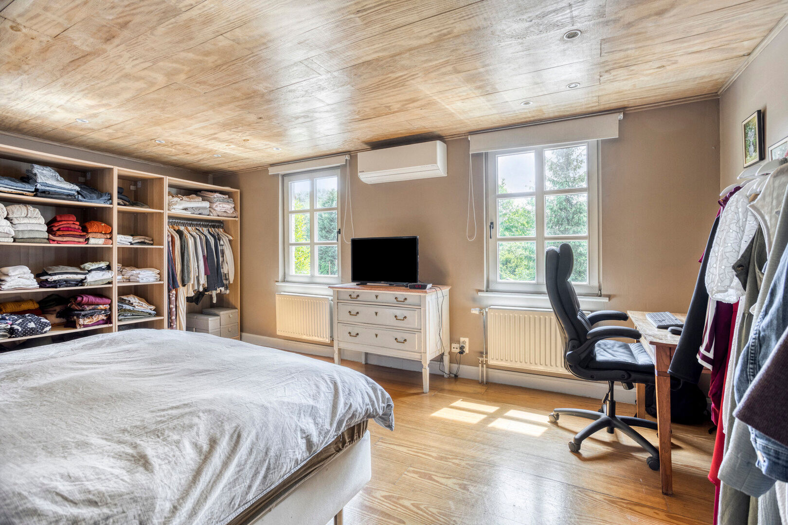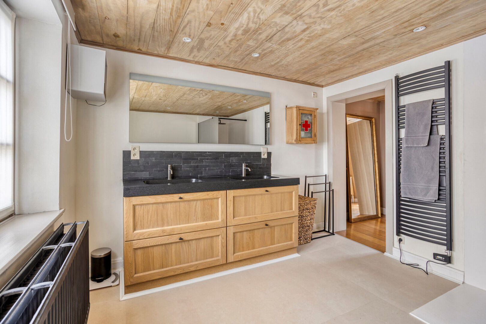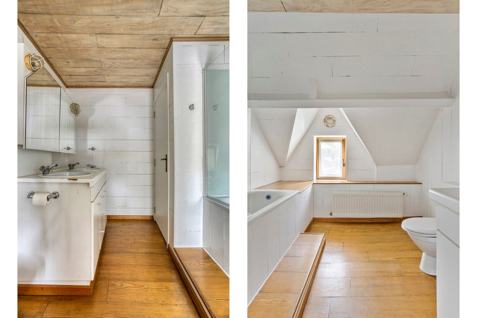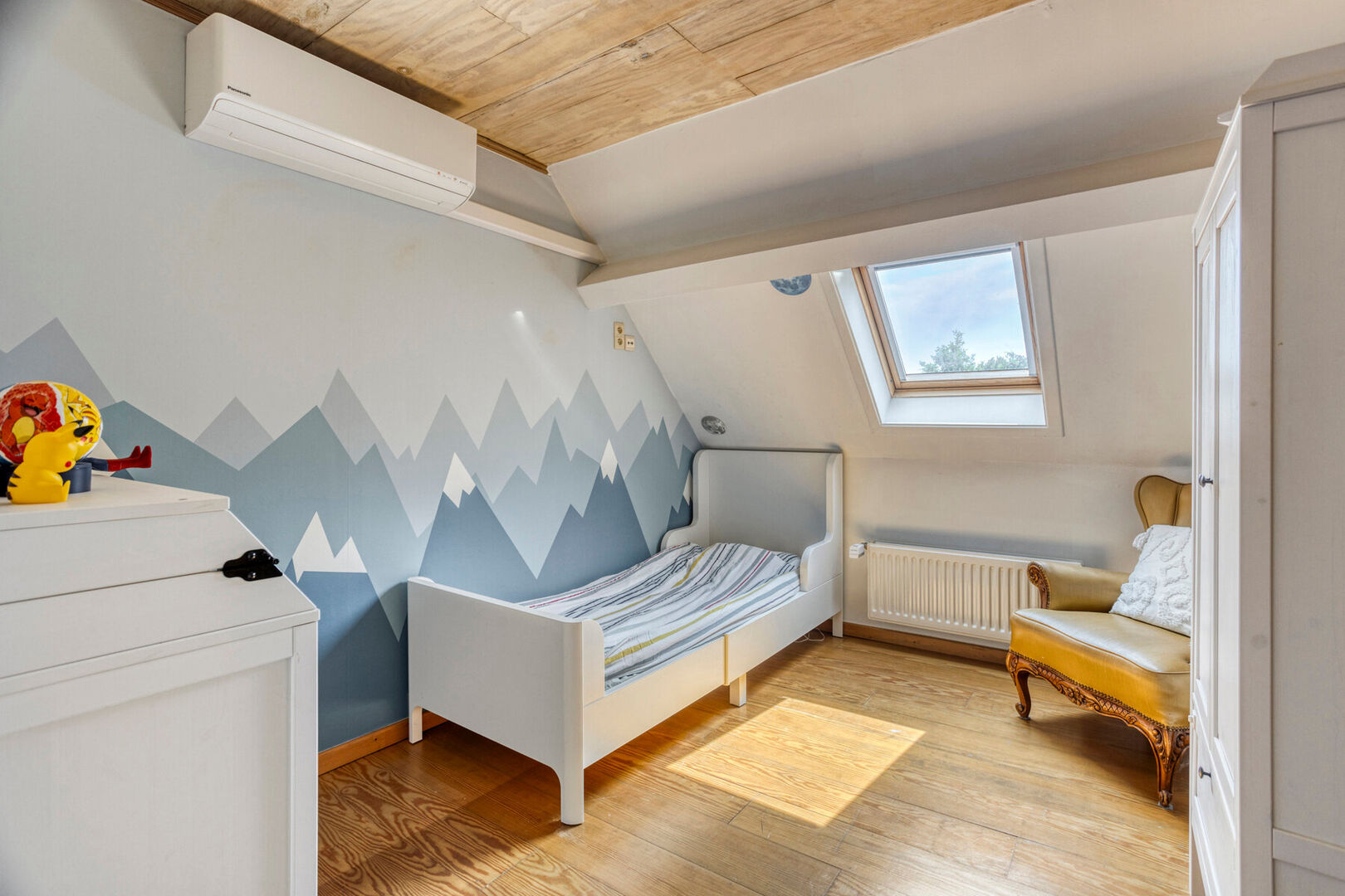 De eerste verdieping betreed je via de open trap in de woonkamer. Hier tref je een zeer ruime master bedroom met ensuite de eerste en recent vernieuwde, badkamer met XL-inloopdouche, toilet en dubbele wastafel met prachtig meubel. De trap leidt je verder naar de bovenste verdieping (onder hellend dak) waar zich een bergkamer, twee slaapkamers en een tweede badkamer met ligbad, toilet en dubbele wastafel bevinden. De slaapkamers werden allen uitgerust met airconditioning.