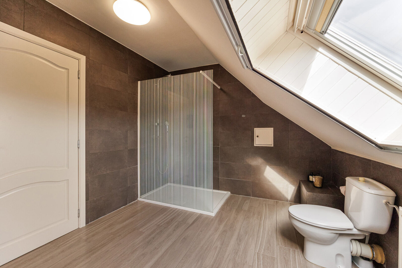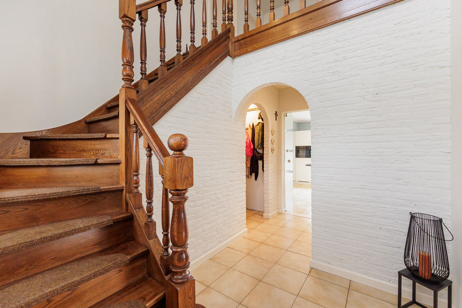 Terug naar de inkomhal, bereik je via de statige, eiken trap een ruime overloop. Deze leidt naar de 4 ruime slaapkamers en de vernieuwde badkamer met diepe inloopdouche. Via het zolderluik in één van de slaapkamers bereik je bovendien de bergzolder.