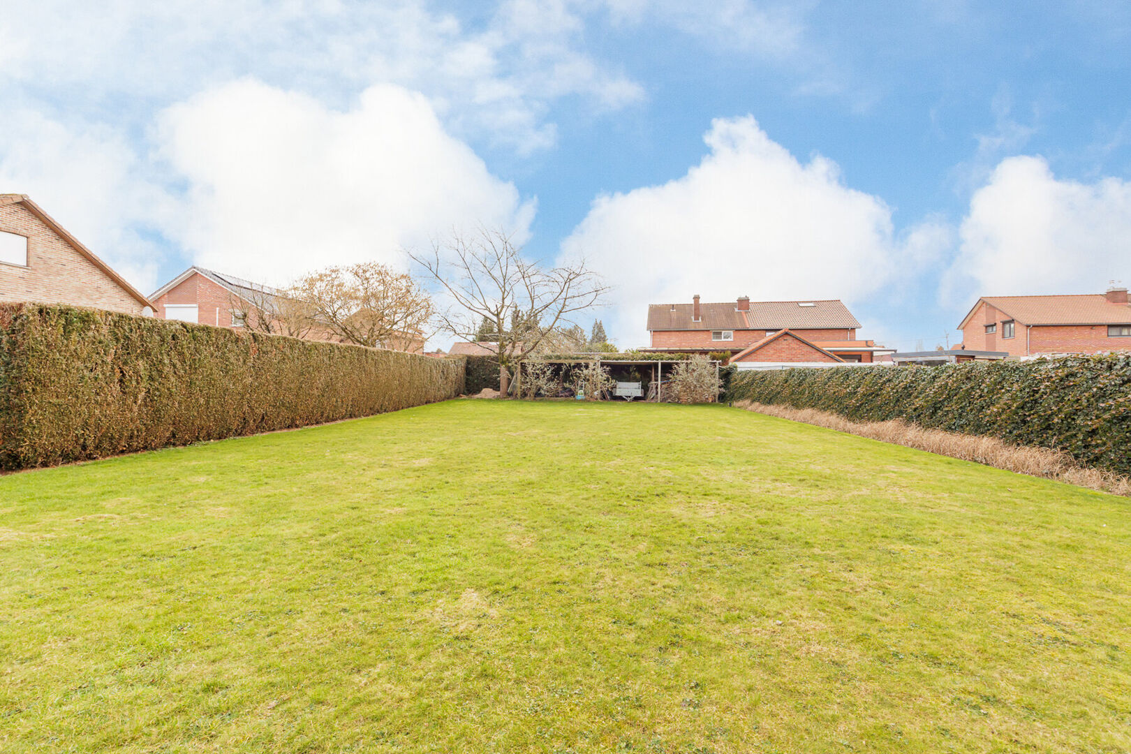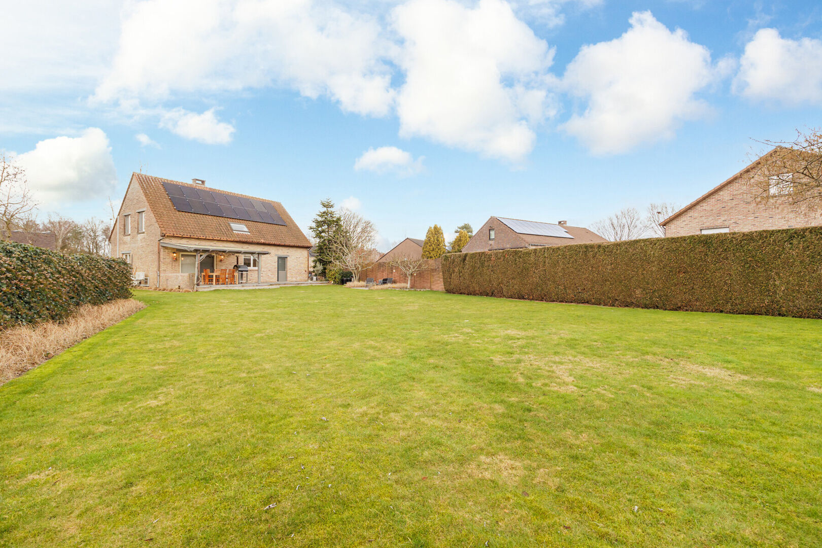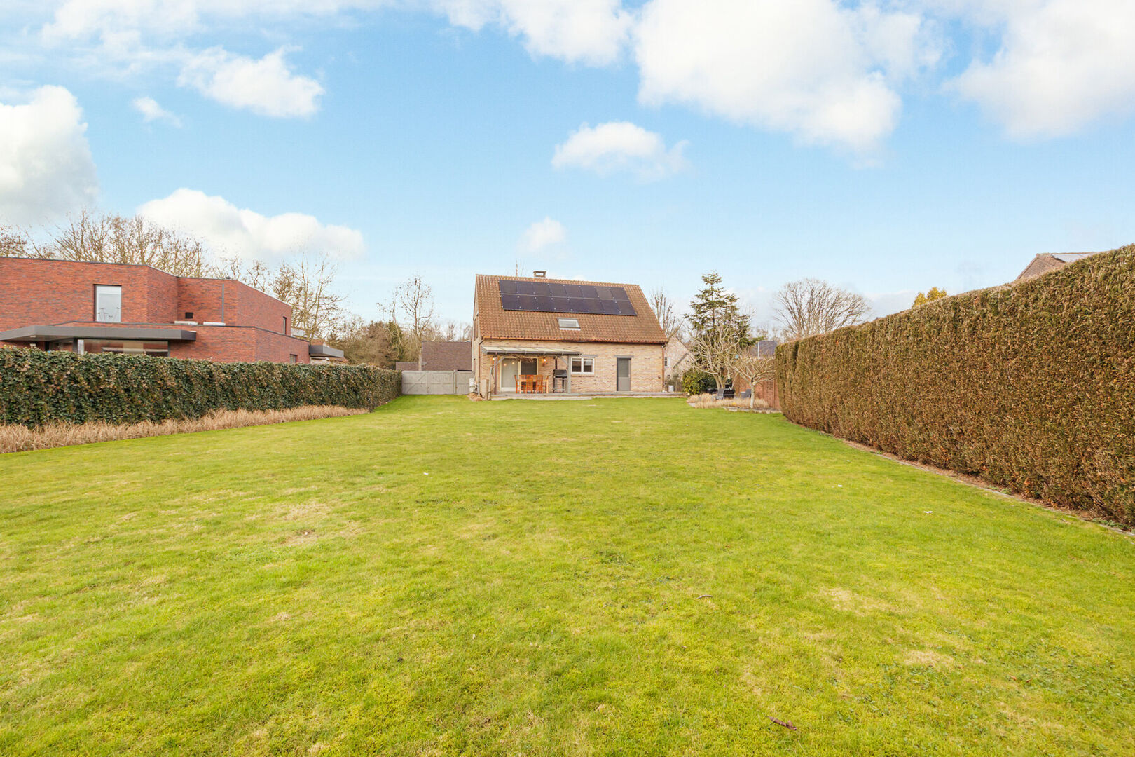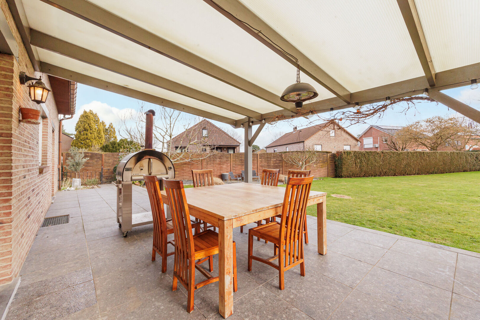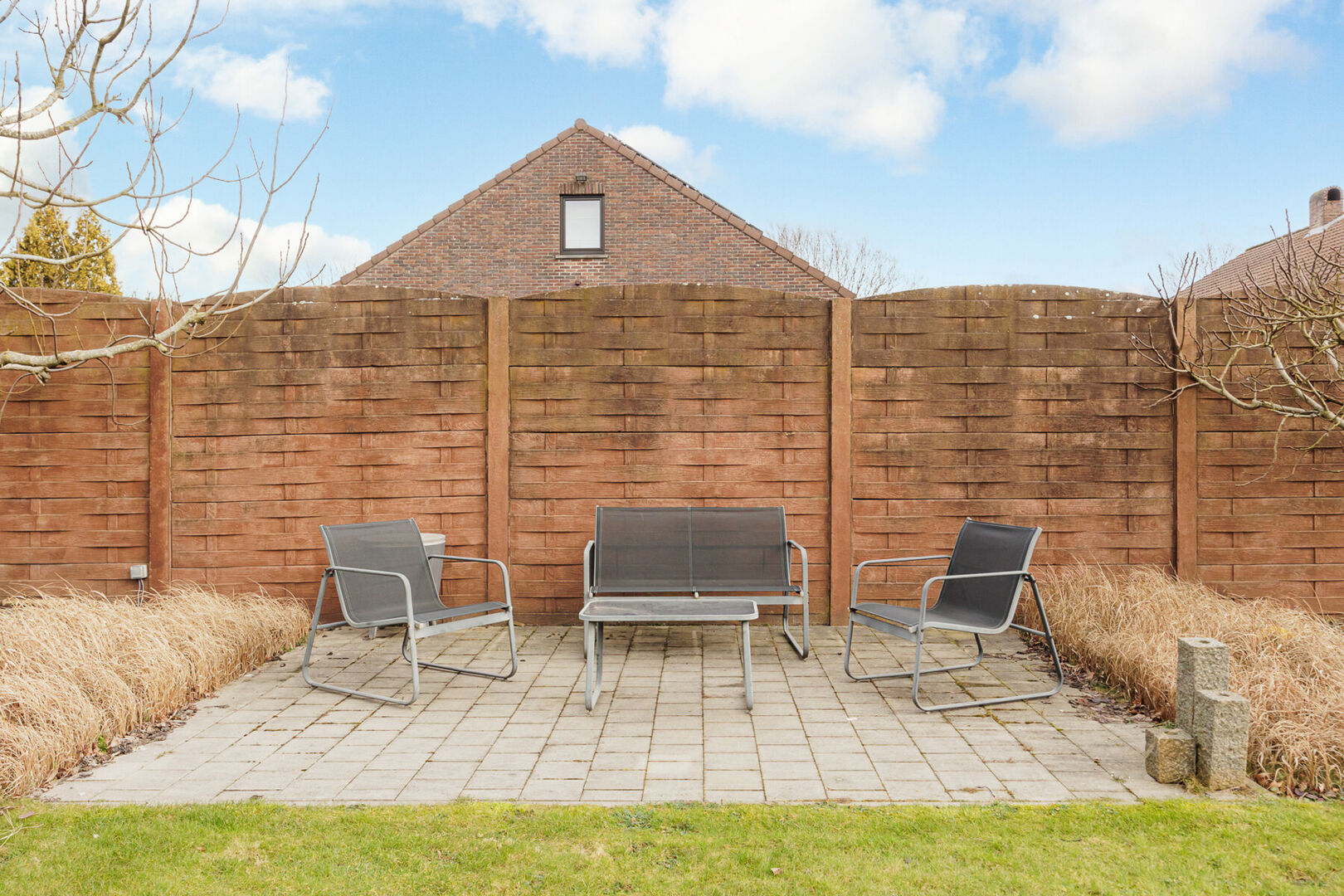 Stilstaan bij de buitenzijde van de woning is ook de moeite waard. De tuin is zuidoostelijk gericht en geniet dus een ideale oriëntatie. De volledige tuin is omheind, uitgerust met een draaipoort (voor de wagen) en 2 tuinpoortjes. Een groot betegeld zonneterras (deels overdekt) garandeert genieten van de lente- en zomerdagen. De ruime grastuin werd voorzien van een automatisch sproei-systeem.