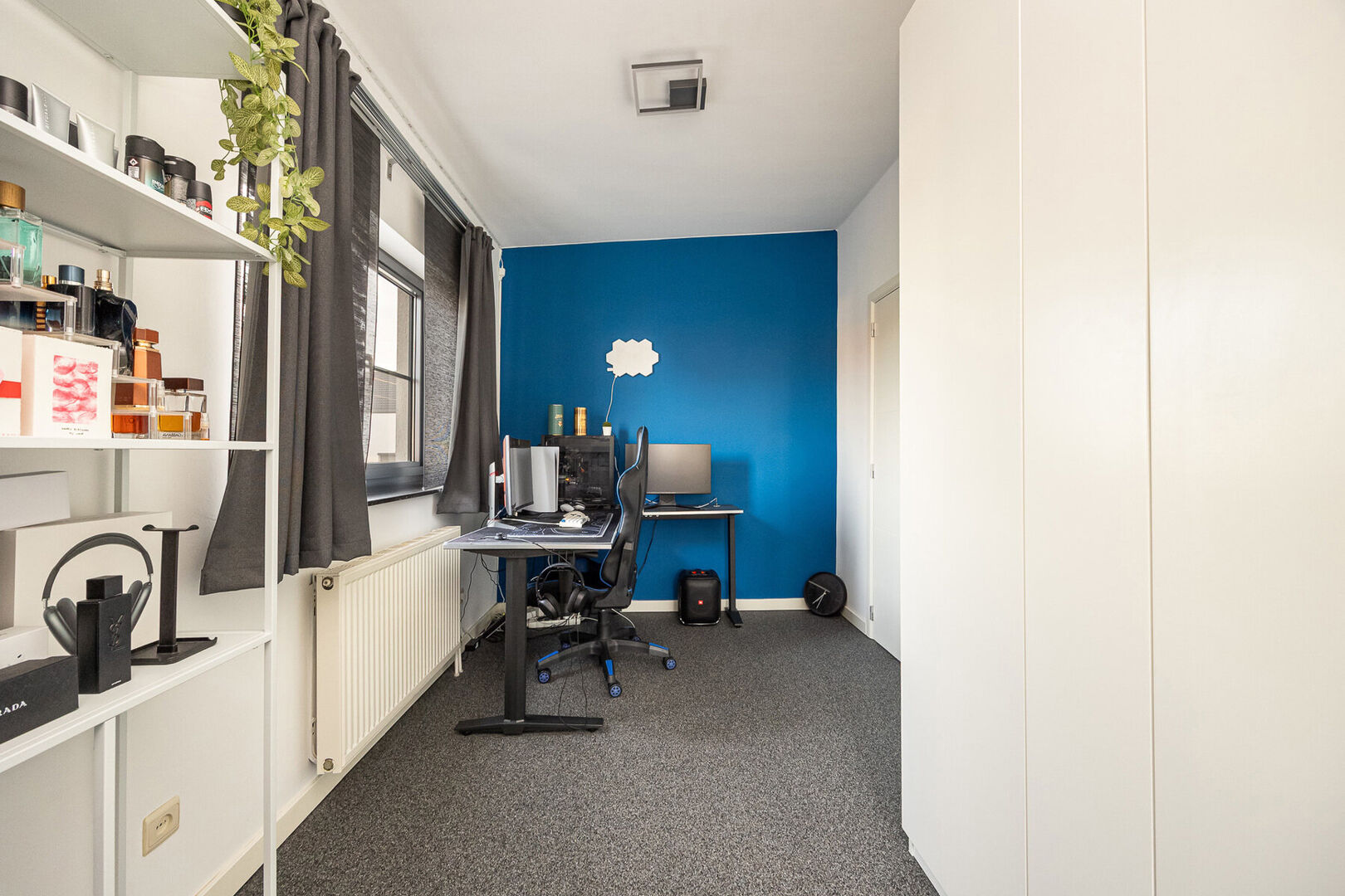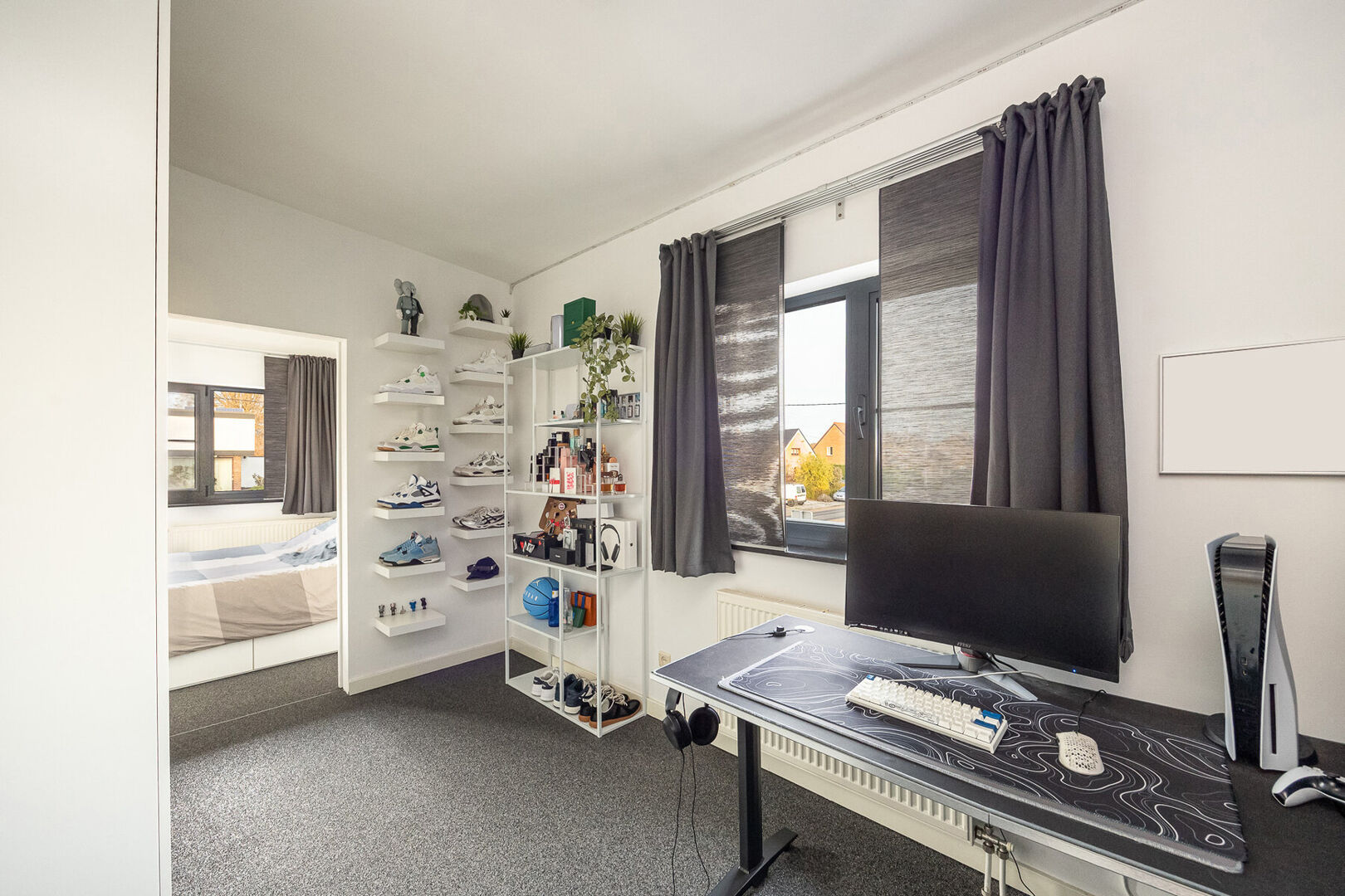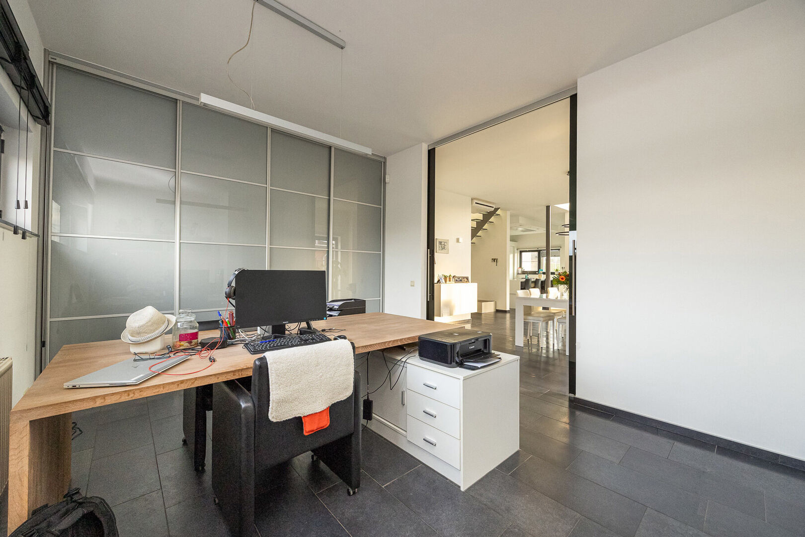 De woning beschikt over drie volwaardige slaapkamers, elk met een aansluitende dressing, en twee stijlvol afgewerkte badkamers die rust en comfort uitstralen. De dressings van de kinderkamers kunnen ook perfect als extra slaapkamer dienen waardoor men over 5 slaapkamers beschikt. Zowel op het gelijkvloers als op de verdieping is er een aparte bureauruimte, ideaal voor thuiswerk of hobby’s. Daarnaast biedt een praktische kelder extra bergruimte.