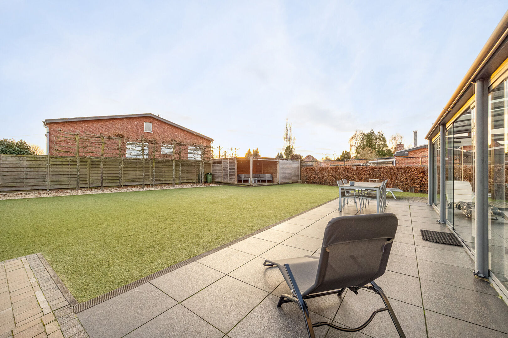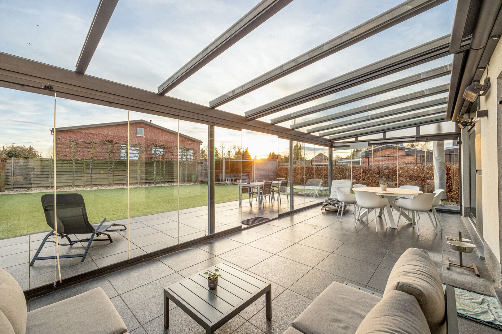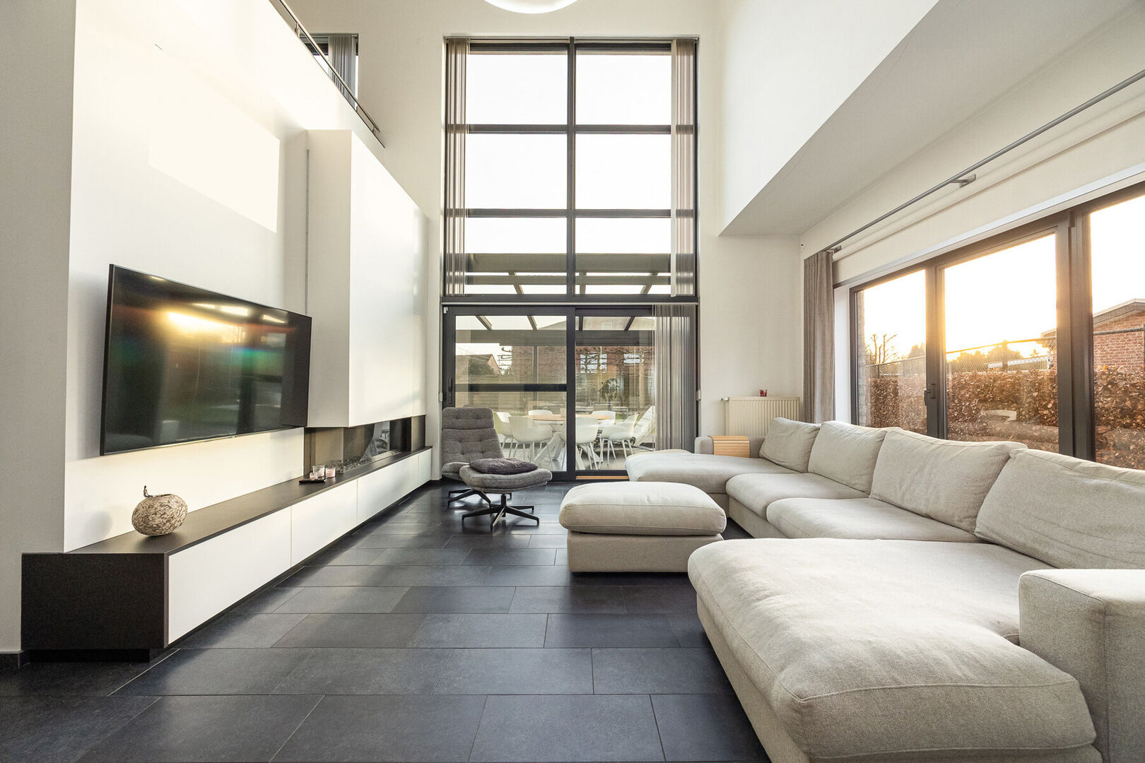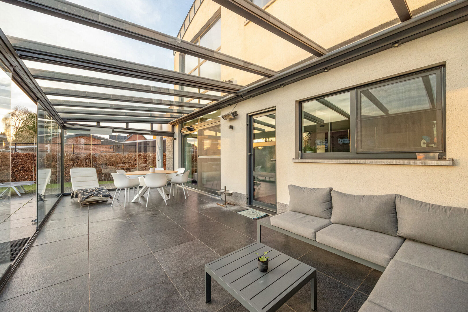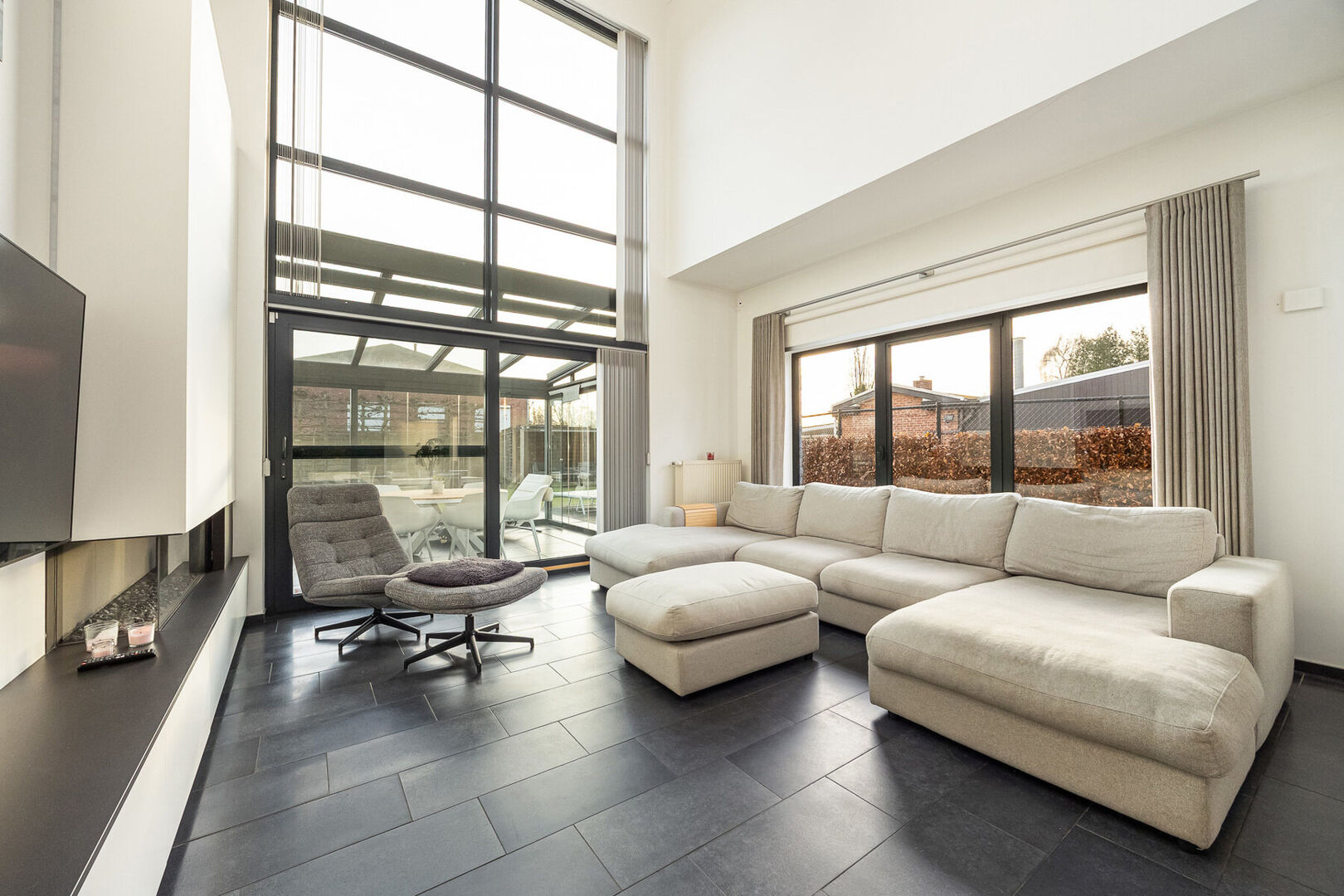 Bij het binnenkomen valt meteen de indrukwekkend hoge en lichtrijke leefruimte op, waar grote raampartijen én een sfeervolle gashaard zorgen voor een warme, uitnodigende atmosfeer. De prachtige open keuken is volledig uitgerust met kwalitatieve A-merk toestellen en vormt het kloppend hart van het huis. Aansluitend aan de leefruimte en met zicht op de tuin ligt een charmante veranda, een heerlijke plek om te genieten van het buitengevoel in alle seizoenen.