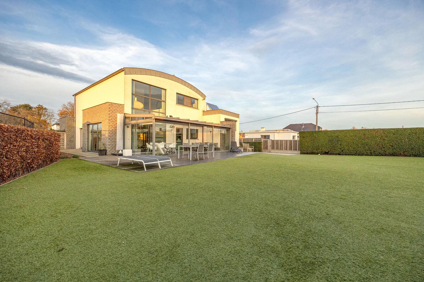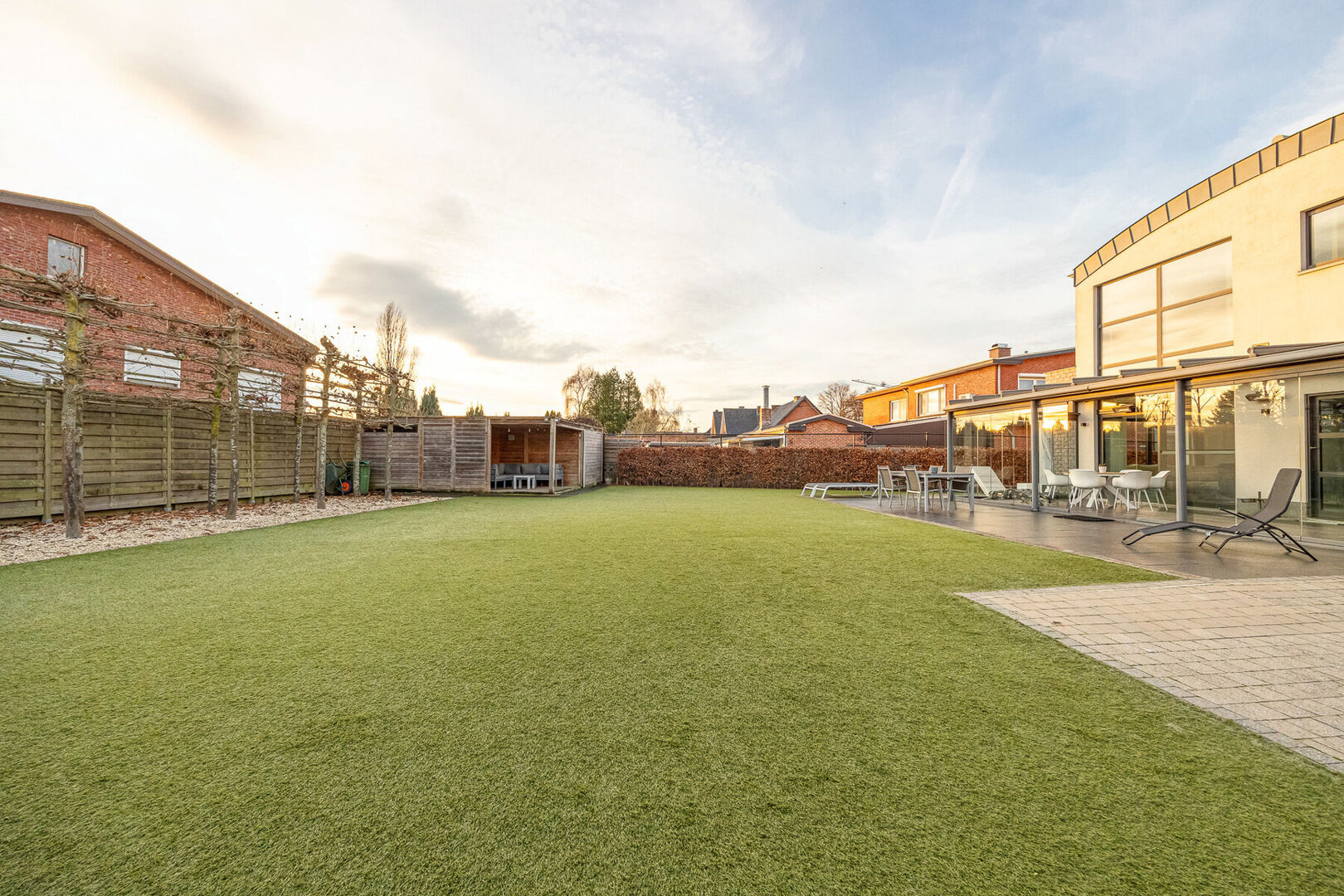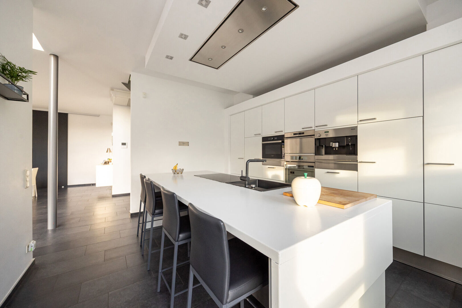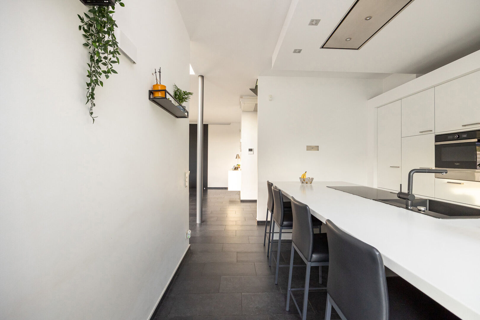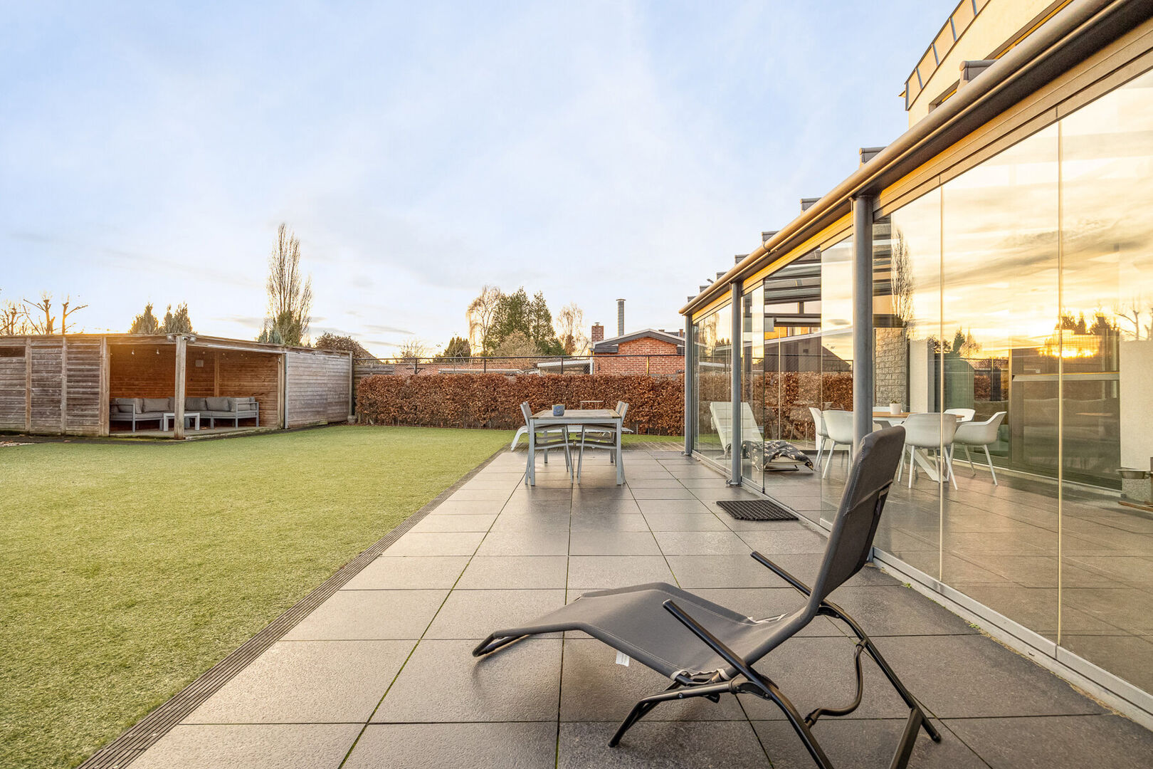 Bij het binnenkomen valt meteen de indrukwekkend hoge en lichtrijke leefruimte op, waar grote raampartijen én een sfeervolle gashaard zorgen voor een warme, uitnodigende atmosfeer. De prachtige open keuken is volledig uitgerust met kwalitatieve A-merk toestellen en vormt het kloppend hart van het huis. Aansluitend aan de leefruimte en met zicht op de tuin ligt een charmante veranda, een heerlijke plek om te genieten van het buitengevoel in alle seizoenen.