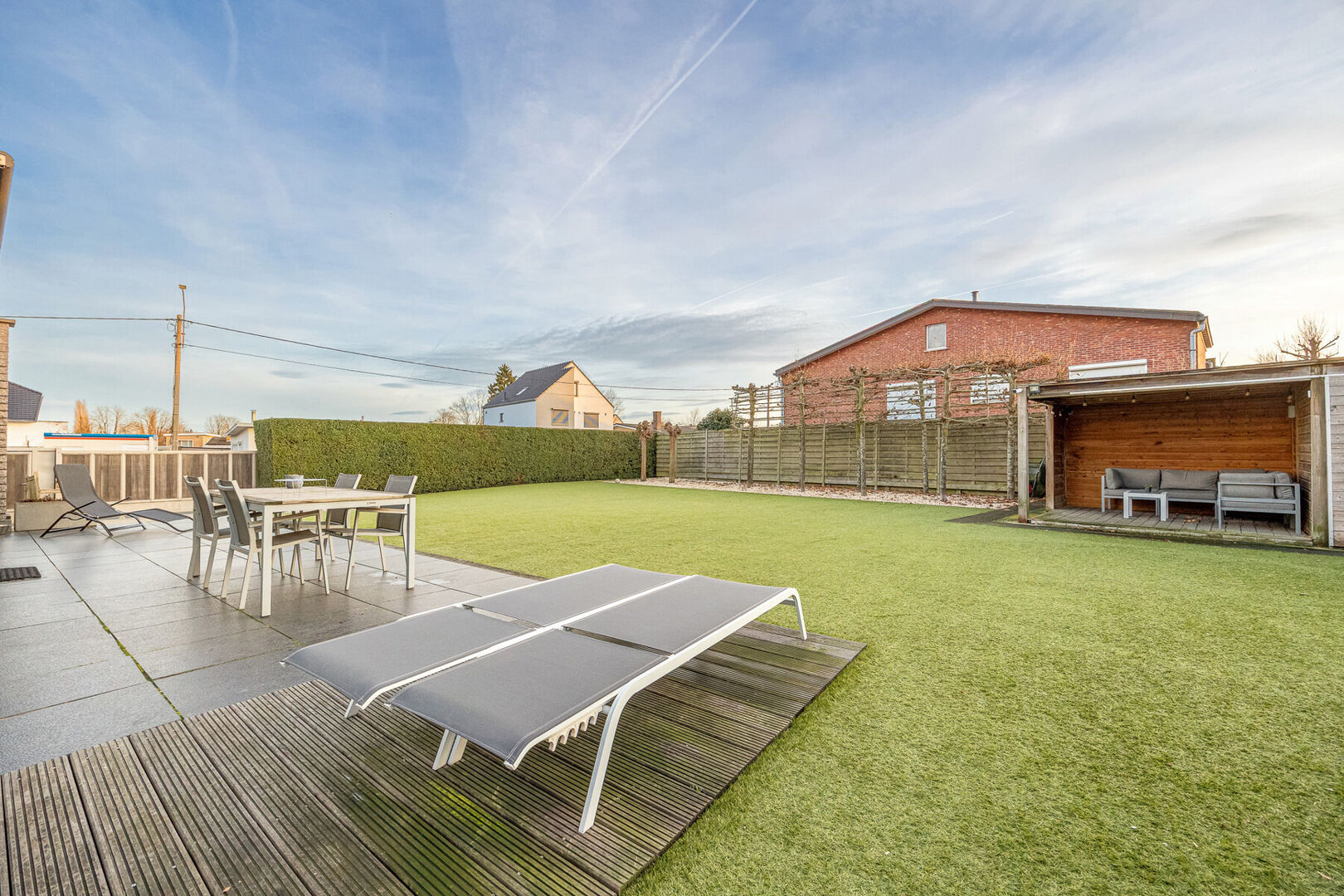 Buiten wacht een groot zuidelijk gericht terras, perfect om te ontspannen of gasten te ontvangen, en meerdere autostaanplaatsen voor uw comfort. Technisch is deze woning uitstekend uitgerust met 18 zonnepanelen, een zonneboiler en airconditioning in de slaapkamers en leefruimte, wat bijdraagt aan een gunstige energieprestatie met een EPC-label C (net geen B).