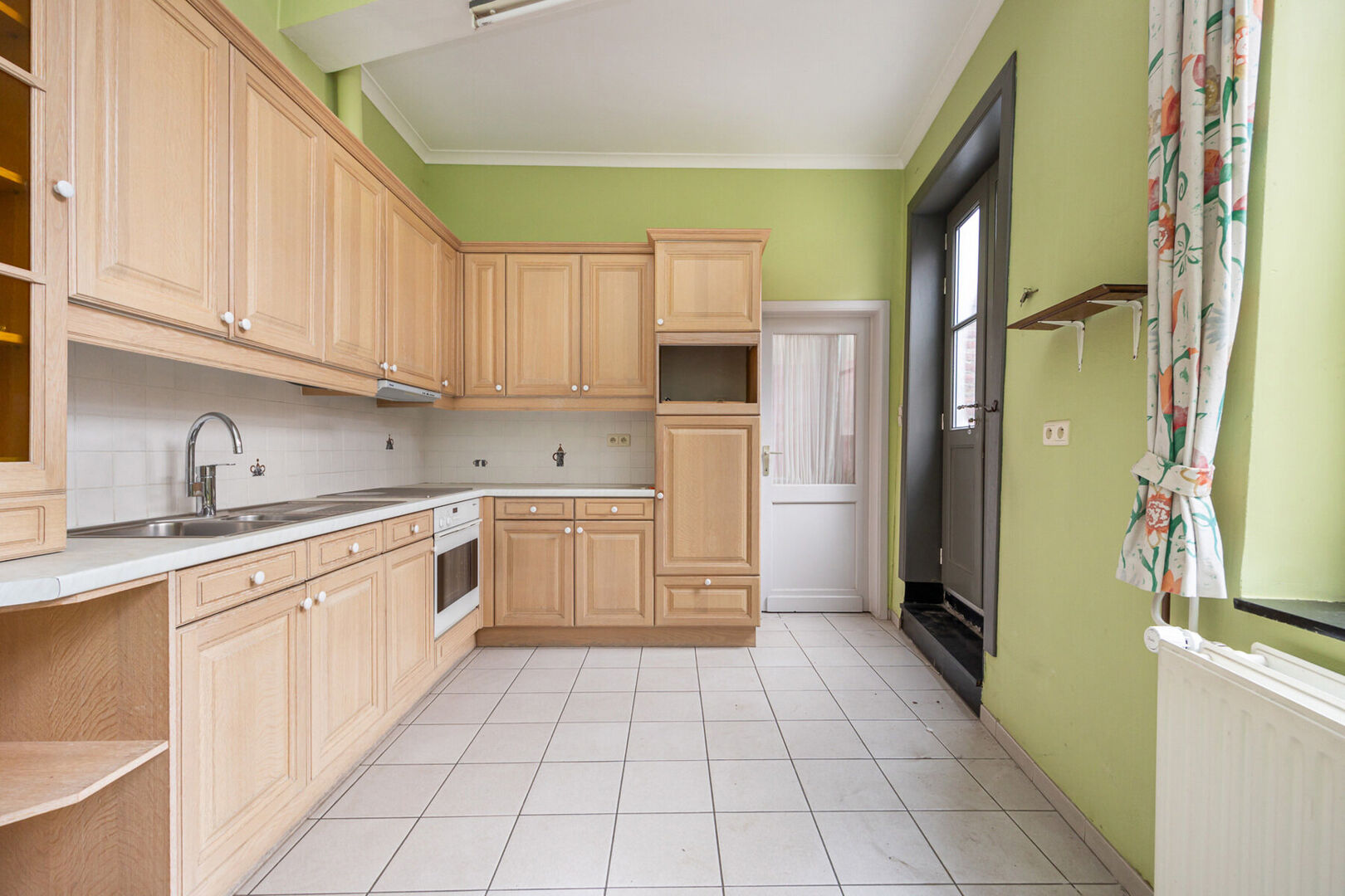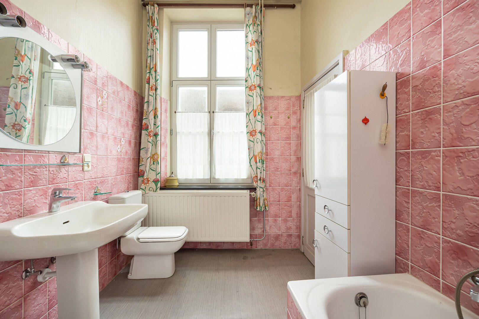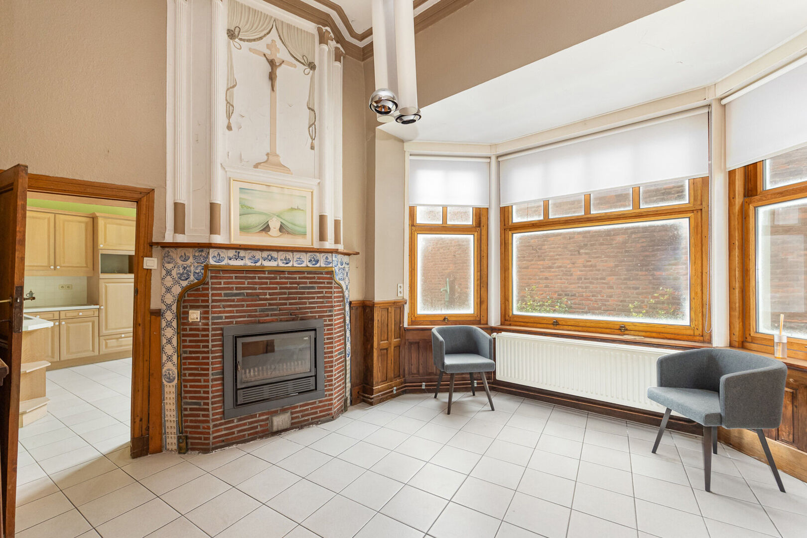 Vanuit de handelsruimte kan de burgerwoning betreden worden. Typerend hier zijn de torenhoge plafonds en de authentieke afwerking van de woning. We vinden op de gelijkvloerse verdieping een ruime woon- en eetkamer, een gemoderniseerde keuken, een ingerichte badkamer en een imposante trappenhal terug. Het faux-marble in deze trappenhal is hier zeker een aandachtstrekker.
