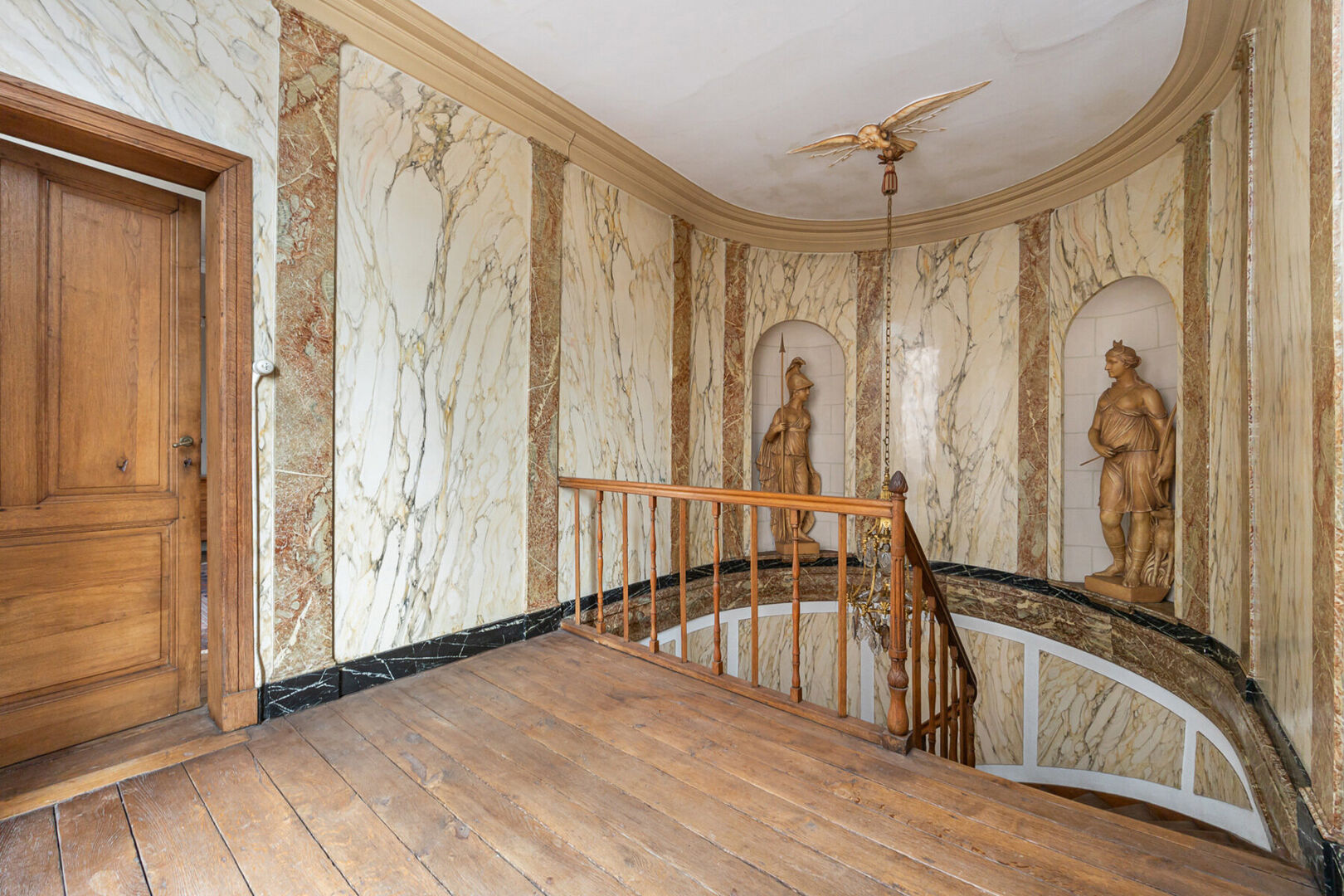 Op de eerste verdieping vinden we dan 6 slaapkamers terug die variëren in verschillende grotes. Ook hier blijft de authentieke afwerking aanwezig en biedt iedere ruimte zijn eigen mogelijkheid. De mooi weggewerkte diensttrap, die tevens volledig tot in de kelder gaat, verschaft de toegang tot de ruime, nog in te richten zolder waarbij de houten balken zijn authentieke touch geven aan deze ruimte.
