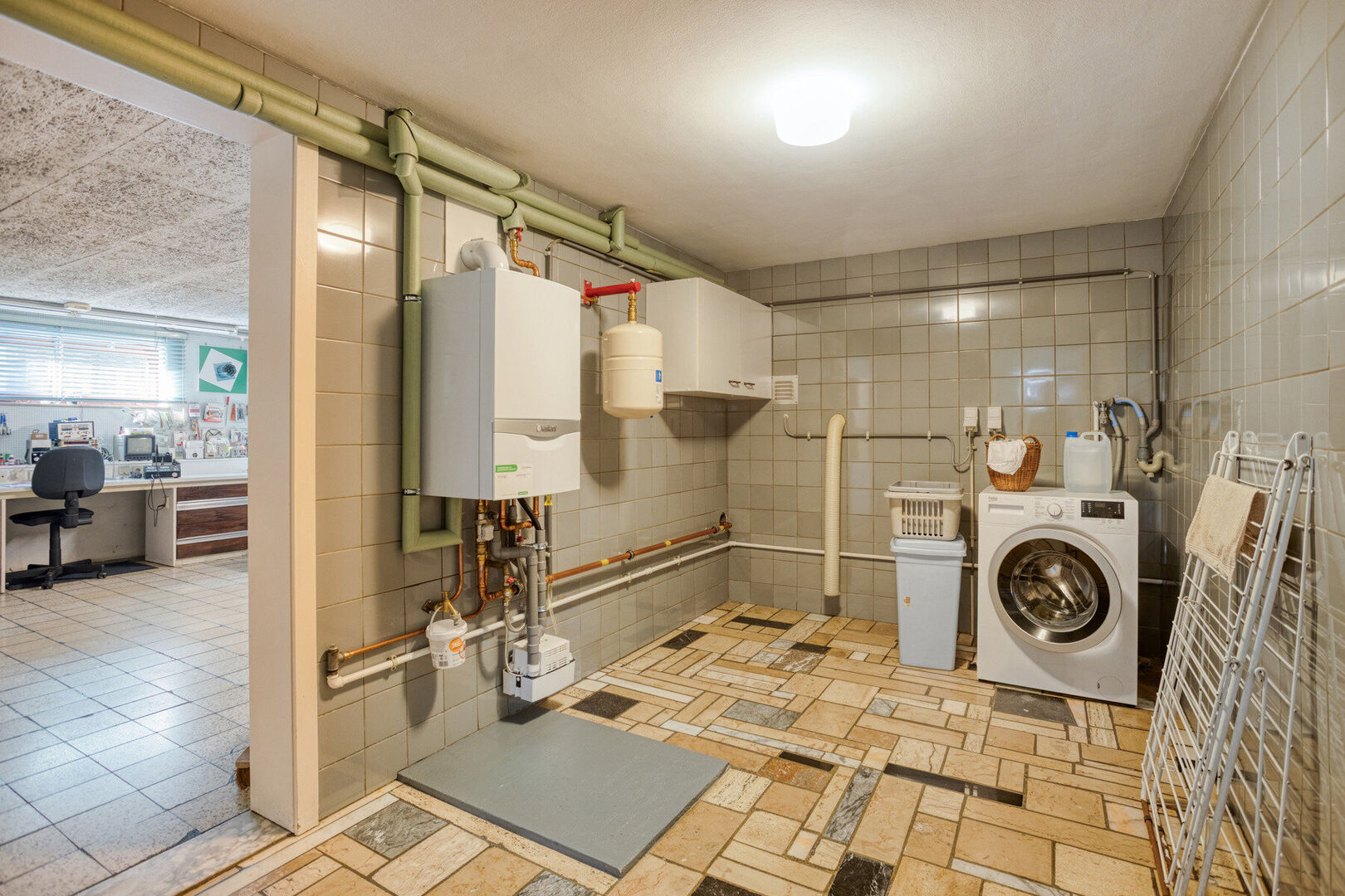 De kelderverdieping biedt veel mogelijkheden. In de hal naar de kelder vindt men het zolderluik met vlizo-trap die heel wat bergruimte biedt. De kelder zelf bestaat uit meerdere ruimten: een hal, provisieruimte, een inpandige garage met elektrische poort waar men 2 wagens na elkaar kan parkeren, bergruimte voor tuingerief / fietsen, een wasplaats, 2 afgewerkte hobby-ruimtes en nog een extra ruimte voor opslag. Dankzij de kelderverdieping biedt de woning dus extra veel bergruimte en plaats voor atelier, hobby- en of speelkamer(s).